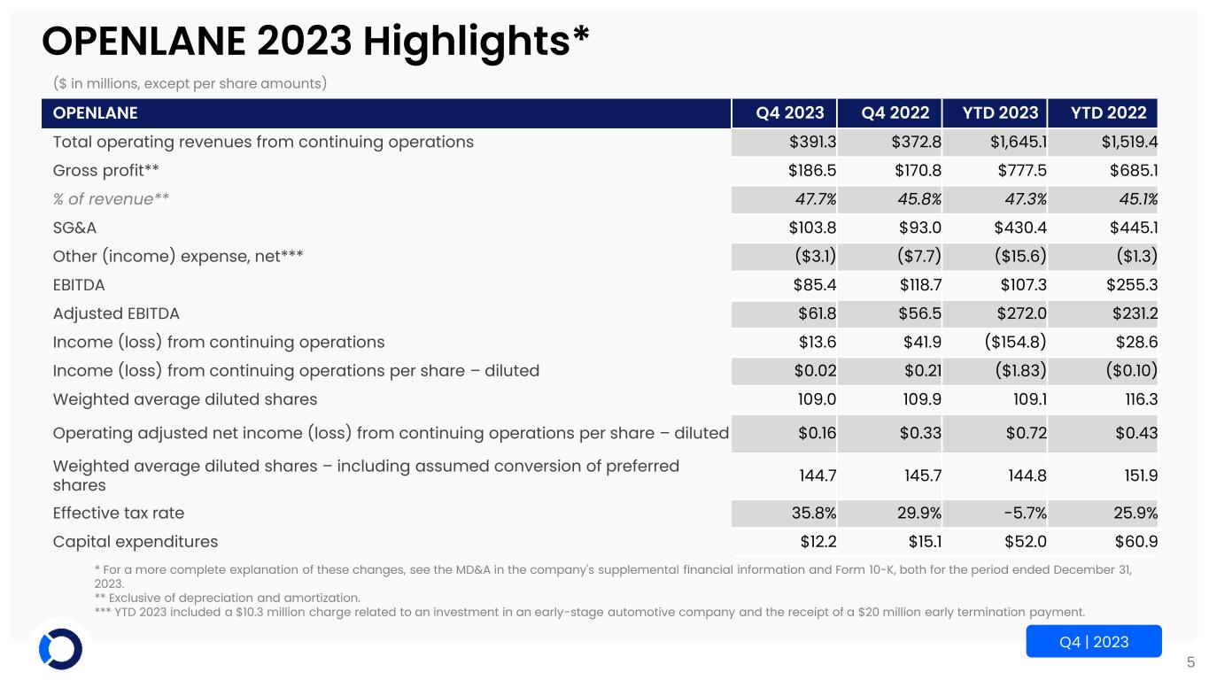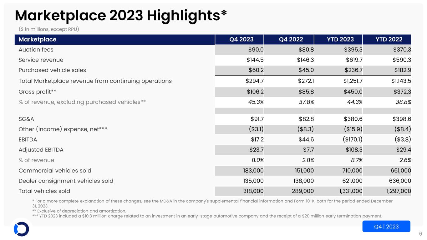 5 Q4 | 2023 OPENLANE 2023 Highlights* ($ in millions, except per share amounts) OPENLANE Q4 2023 Q4 2022 YTD 2023 YTD 2022 Total operating revenues from continuing operations $391.3 $372.8 $1,645.1 $1,519.4 Gross profit** $186.5 $170.8 $777.5 $685.1 % of revenue** 47.7% 45.8% 47.3% 45.1% SG&A $103.8 $93.0 $430.4 $445.1 Other (income) expense, net*** ($3.1) ($7.7) ($15.6) ($1.3) EBITDA $85.4 $118.7 $107.3 $255.3 Adjusted EBITDA $61.8 $56.5 $272.0 $231.2 Income (loss) from continuing operations $13.6 $41.9 ($154.8) $28.6 Income (loss) from continuing operations per share – diluted $0.02 $0.21 ($1.83) ($0.10) Weighted average diluted shares 109.0 109.9 109.1 116.3 Operating adjusted net income (loss) from continuing operations per share – diluted $0.16 $0.33 $0.72 $0.43 Weighted average diluted shares – including assumed conversion of preferred shares 144.7 145.7 144.8 151.9 Effective tax rate 35.8% 29.9% -5.7% 25.9% Capital expenditures $12.2 $15.1 $52.0 $60.9 * For a more complete explanation of these changes, see the MD&A in the company's supplemental financial information and Form 10-K, both for the period ended December 31, 2023. ** Exclusive of depreciation and amortization. *** YTD 2023 included a $10.3 million charge related to an investment in an early-stage automotive company and the receipt of a $20 million early termination payment.