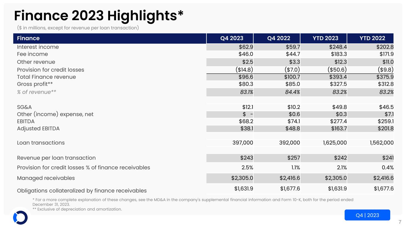 6 Q4 | 2023 Marketplace 2023 Highlights* ($ in millions, except RPU) Marketplace Q4 2023 Q4 2022 YTD 2023 YTD 2022 Auction fees $90.0 $80.8 $395.3 $370.3 Service revenue $144.5 $146.3 $619.7 $590.3 Purchased vehicle sales $60.2 $45.0 $236.7 $182.9 Total Marketplace revenue from continuing operations $294.7 $272.1 $1,251.7 $1,143.5 Gross profit** $106.2 $85.8 $450.0 $372.3 % of revenue, excluding purchased vehicles** 45.3% 37.8% 44.3% 38.8% SG&A $91.7 $82.8 $380.6 $398.6 Other (income) expense, net*** ($3.1) ($8.3) ($15.9) ($8.4) EBITDA $17.2 $44.6 ($170.1) ($3.8) Adjusted EBITDA $23.7 $7.7 $108.3 $29.4 % of revenue 8.0% 2.8% 8.7% 2.6% Commercial vehicles sold 183,000 151,000 710,000 661,000 Dealer consignment vehicles sold 135,000 138,000 621,000 636,000 Total vehicles sold 318,000 289,000 1,331,000 1,297,000 * For a more complete explanation of these changes, see the MD&A in the company's supplemental financial information and Form 10-K, both for the period ended December 31, 2023. ** Exclusive of depreciation and amortization. *** YTD 2023 included a $10.3 million charge related to an investment in an early-stage automotive company and the receipt of a $20 million early termination payment.