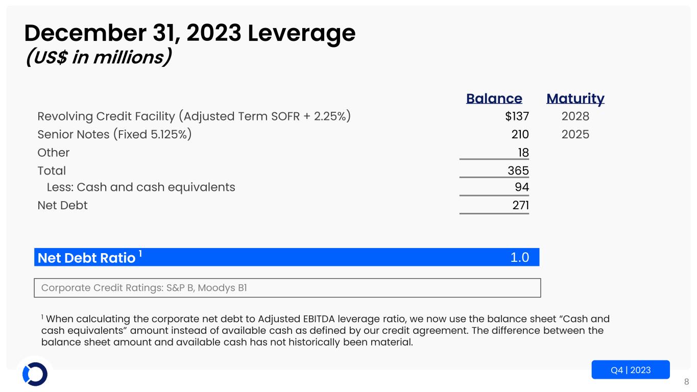 8 Q4 | 2023 December 31, 2023 Leverage (US$ in millions) Balance Maturity Revolving Credit Facility (Adjusted Term SOFR + 2.25%) $137 2028 Senior Notes (Fixed 5.125%) 210 2025 Other 18 Total 365 Less: Cash and cash equivalents 94 Net Debt 271 Net Debt Ratio 1 1.0 Corporate Credit Ratings: S&P B, Moodys B1 1 When calculating the corporate net debt to Adjusted EBITDA leverage ratio, we now use the balance sheet “Cash and cash equivalents” amount instead of available cash as defined by our credit agreement. The difference between the balance sheet amount and available cash has not historically been material.