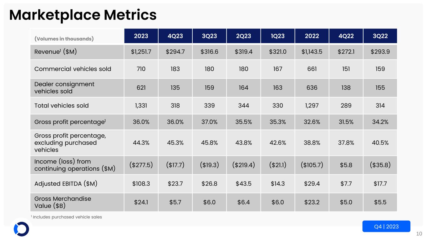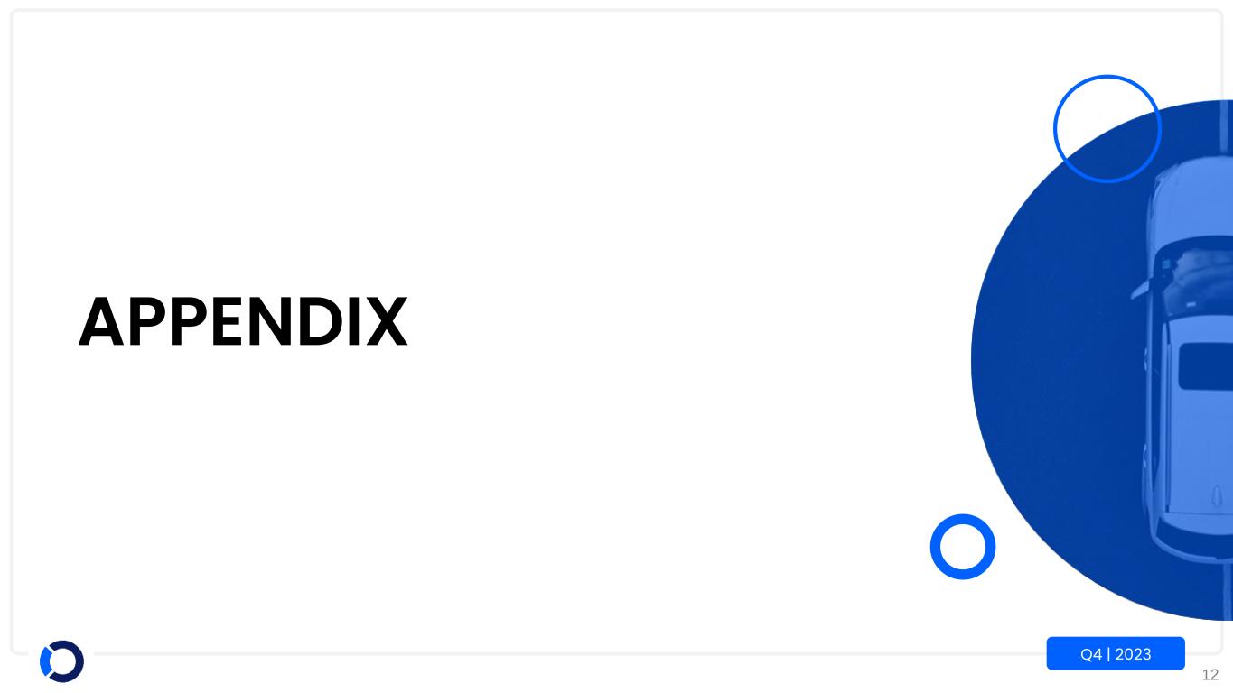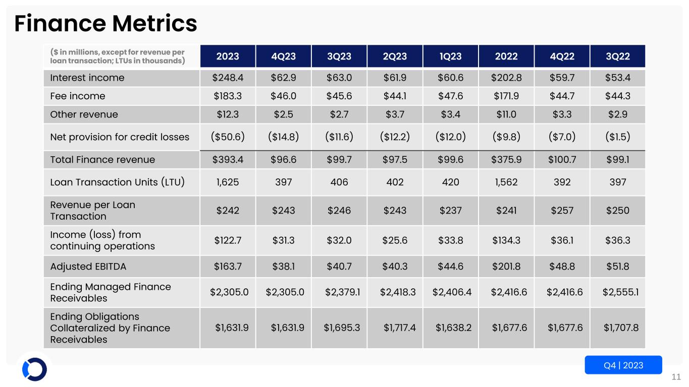 10 Q4 | 2023 Marketplace Metrics (Volumes in thousands) 2023 4Q23 3Q23 2Q23 1Q23 2022 4Q22 3Q22 Revenue1 ($M) $1,251.7 $294.7 $316.6 $319.4 $321.0 $1,143.5 $272.1 $293.9 Commercial vehicles sold 710 183 180 180 167 661 151 159 Dealer consignment vehicles sold 621 135 159 164 163 636 138 155 Total vehicles sold 1,331 318 339 344 330 1,297 289 314 Gross profit percentage1 36.0% 36.0% 37.0% 35.5% 35.3% 32.6% 31.5% 34.2% Gross profit percentage, excluding purchased vehicles 44.3% 45.3% 45.8% 43.8% 42.6% 38.8% 37.8% 40.5% Income (loss) from continuing operations ($M) ($277.5) ($17.7) ($19.3) ($219.4) ($21.1) ($105.7) $5.8 ($35.8) Adjusted EBITDA ($M) $108.3 $23.7 $26.8 $43.5 $14.3 $29.4 $7.7 $17.7 Gross Merchandise Value ($B) $24.1 $5.7 $6.0 $6.4 $6.0 $23.2 $5.0 $5.5 1 Includes purchased vehicle sales
