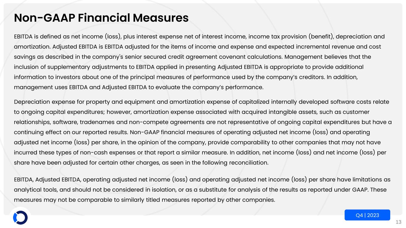 13 Q4 | 2023 Non-GAAP Financial Measures EBITDA is defined as net income (loss), plus interest expense net of interest income, income tax provision (benefit), depreciation and amortization. Adjusted EBITDA is EBITDA adjusted for the items of income and expense and expected incremental revenue and cost savings as described in the company's senior secured credit agreement covenant calculations. Management believes that the inclusion of supplementary adjustments to EBITDA applied in presenting Adjusted EBITDA is appropriate to provide additional information to investors about one of the principal measures of performance used by the company’s creditors. In addition, management uses EBITDA and Adjusted EBITDA to evaluate the company’s performance. Depreciation expense for property and equipment and amortization expense of capitalized internally developed software costs relate to ongoing capital expenditures; however, amortization expense associated with acquired intangible assets, such as customer relationships, software, tradenames and non-compete agreements are not representative of ongoing capital expenditures but have a continuing effect on our reported results. Non-GAAP financial measures of operating adjusted net income (loss) and operating adjusted net income (loss) per share, in the opinion of the company, provide comparability to other companies that may not have incurred these types of non-cash expenses or that report a similar measure. In addition, net income (loss) and net income (loss) per share have been adjusted for certain other charges, as seen in the following reconciliation. EBITDA, Adjusted EBITDA, operating adjusted net income (loss) and operating adjusted net income (loss) per share have limitations as analytical tools, and should not be considered in isolation, or as a substitute for analysis of the results as reported under GAAP. These measures may not be comparable to similarly titled measures reported by other companies.
