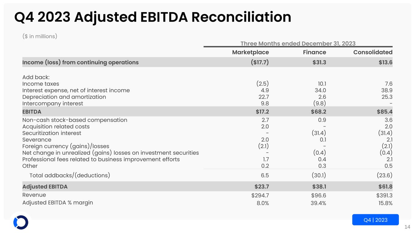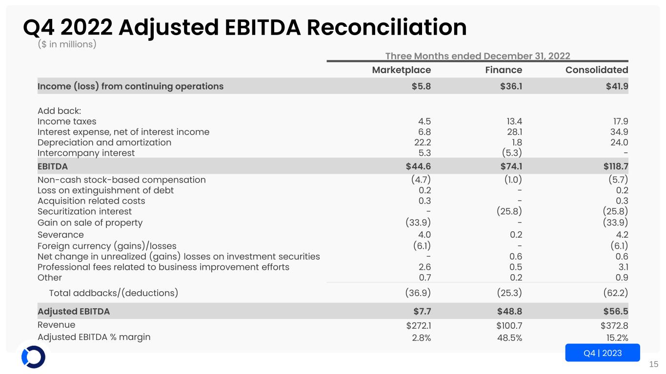 14 Q4 | 2023 Q4 2023 Adjusted EBITDA Reconciliation ($ in millions) Three Months ended December 31, 2023 Marketplace Finance Consolidated Income (loss) from continuing operations ($17.7) $31.3 $13.6 Add back: Income taxes (2.5) 10.1 7.6 Interest expense, net of interest income 4.9 34.0 38.9 Depreciation and amortization 22.7 2.6 25.3 Intercompany interest 9.8 (9.8) - EBITDA $17.2 $68.2 $85.4 Non-cash stock-based compensation 2.7 0.9 3.6 Acquisition related costs 2.0 - 2.0 Securitization interest - (31.4) (31.4) Severance 2.0 0.1 2.1 Foreign currency (gains)/losses (2.1) - (2.1) Net change in unrealized (gains) losses on investment securities - (0.4) (0.4) Professional fees related to business improvement efforts 1.7 0.4 2.1 Other 0.2 0.3 0.5 Total addbacks/(deductions) 6.5 (30.1) (23.6) Adjusted EBITDA $23.7 $38.1 $61.8 Revenue $294.7 $96.6 $391.3 Adjusted EBITDA % margin 8.0% 39.4% 15.8%
