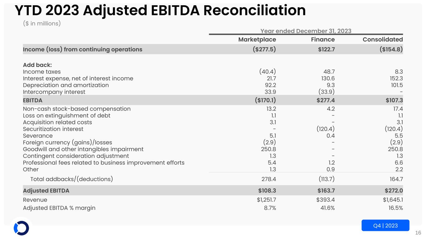 15 Q4 | 2023 Q4 2022 Adjusted EBITDA Reconciliation ($ in millions) Three Months ended December 31, 2022 Marketplace Finance Consolidated Income (loss) from continuing operations $5.8 $36.1 $41.9 Add back: Income taxes 4.5 13.4 17.9 Interest expense, net of interest income 6.8 28.1 34.9 Depreciation and amortization 22.2 1.8 24.0 Intercompany interest 5.3 (5.3) - EBITDA $44.6 $74.1 $118.7 Non-cash stock-based compensation (4.7) (1.0) (5.7) Loss on extinguishment of debt 0.2 - 0.2 Acquisition related costs 0.3 - 0.3 Securitization interest - (25.8) (25.8) Gain on sale of property (33.9) - (33.9) Severance 4.0 0.2 4.2 Foreign currency (gains)/losses (6.1) - (6.1) Net change in unrealized (gains) losses on investment securities - 0.6 0.6 Professional fees related to business improvement efforts 2.6 0.5 3.1 Other 0.7 0.2 0.9 Total addbacks/(deductions) (36.9) (25.3) (62.2) Adjusted EBITDA $7.7 $48.8 $56.5 Revenue $272.1 $100.7 $372.8 Adjusted EBITDA % margin 2.8% 48.5% 15.2%