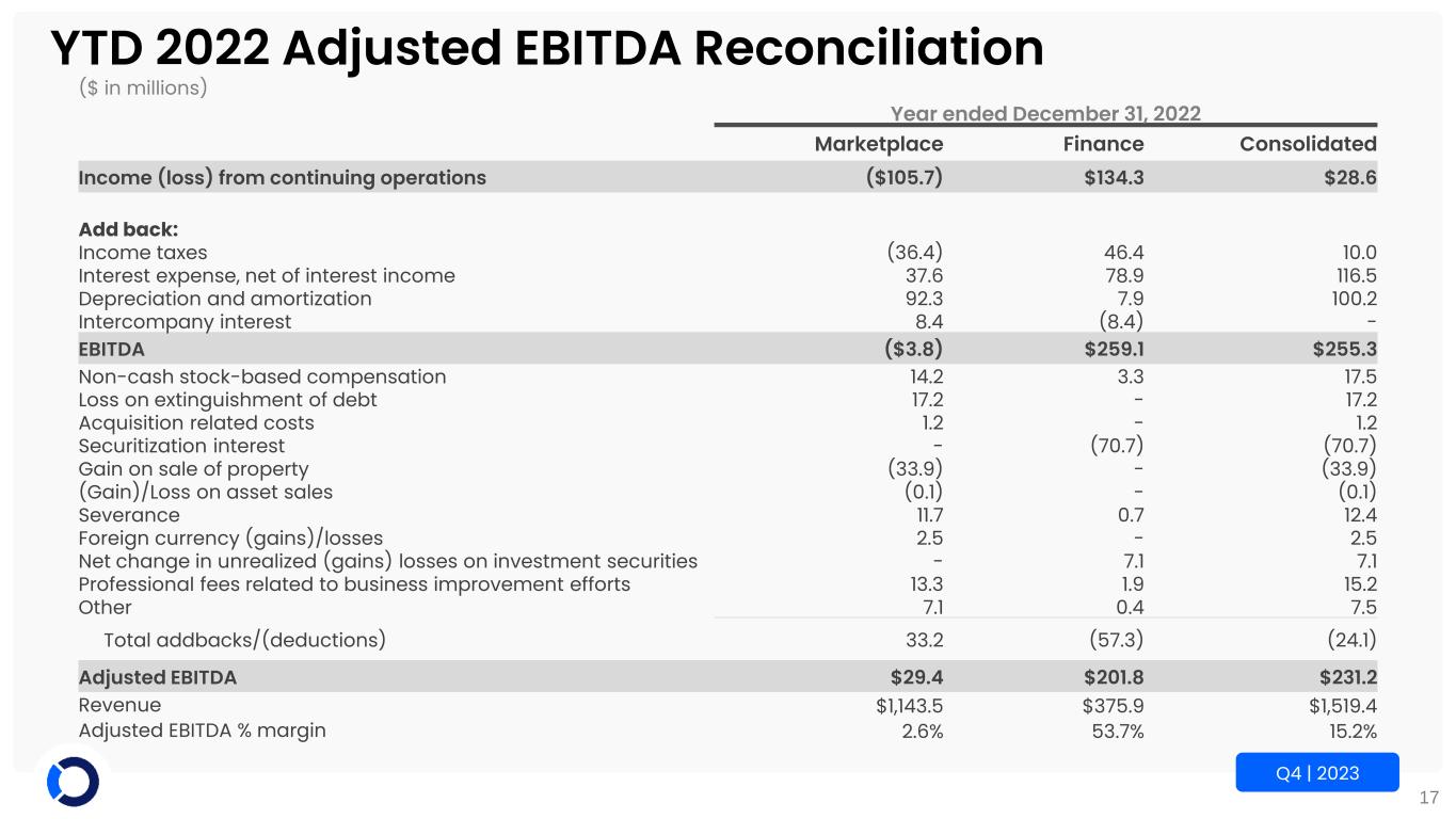 16 Q4 | 2023 YTD 2023 Adjusted EBITDA Reconciliation ($ in millions) Year ended December 31, 2023 Marketplace Finance Consolidated Income (loss) from continuing operations ($277.5) $122.7 ($154.8) Add back: Income taxes (40.4) 48.7 8.3 Interest expense, net of interest income 21.7 130.6 152.3 Depreciation and amortization 92.2 9.3 101.5 Intercompany interest 33.9 (33.9) - EBITDA ($170.1) $277.4 $107.3 Non-cash stock-based compensation 13.2 4.2 17.4 Loss on extinguishment of debt 1.1 - 1.1 Acquisition related costs 3.1 - 3.1 Securitization interest - (120.4) (120.4) Severance 5.1 0.4 5.5 Foreign currency (gains)/losses (2.9) - (2.9) Goodwill and other intangibles impairment 250.8 - 250.8 Contingent consideration adjustment 1.3 - 1.3 Professional fees related to business improvement efforts 5.4 1.2 6.6 Other 1.3 0.9 2.2 Total addbacks/(deductions) 278.4 (113.7) 164.7 Adjusted EBITDA $108.3 $163.7 $272.0 Revenue $1,251.7 $393.4 $1,645.1 Adjusted EBITDA % margin 8.7% 41.6% 16.5%