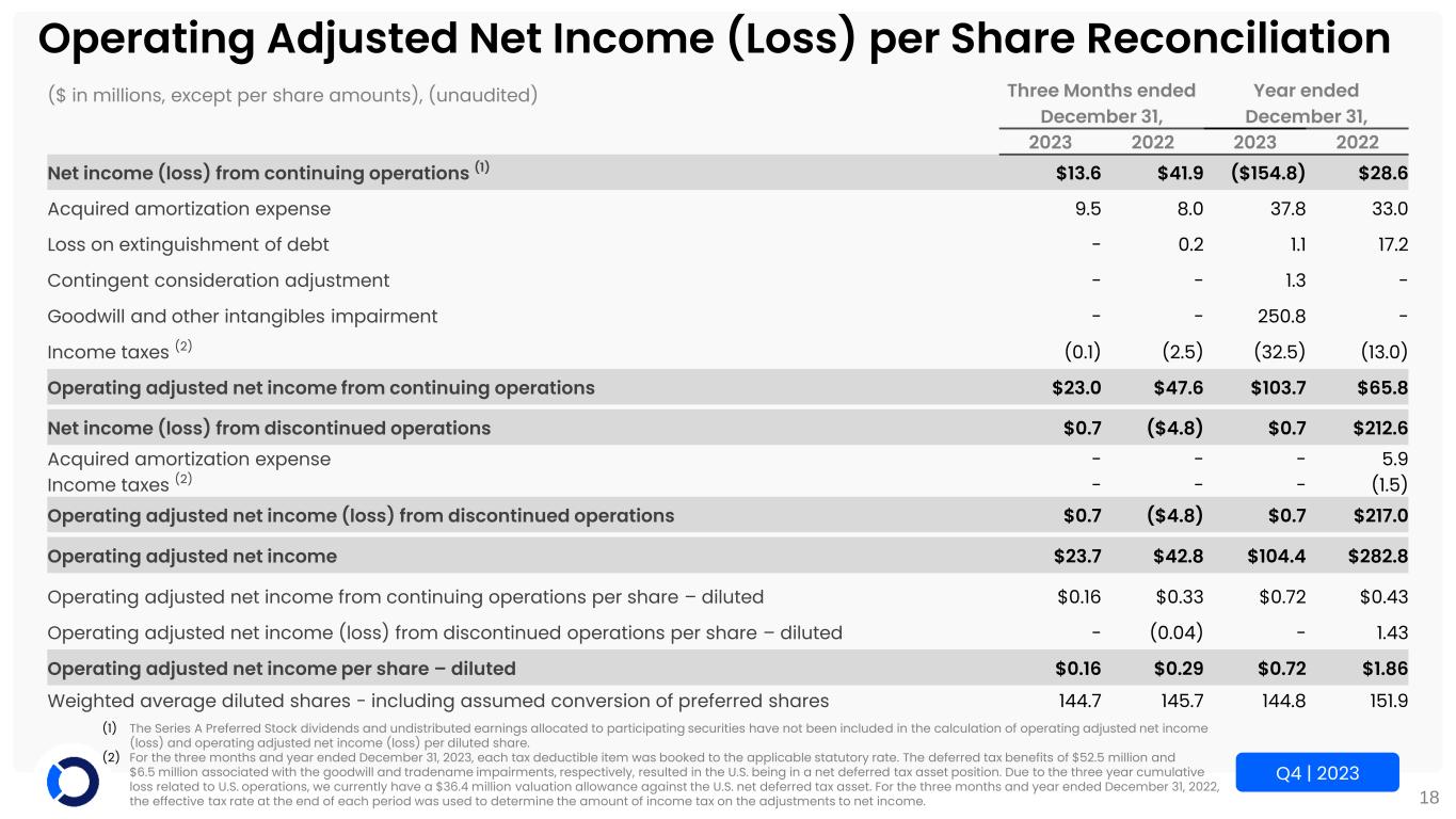 18 Q4 | 2023 Operating Adjusted Net Income (Loss) per Share Reconciliation ($ in millions, except per share amounts), (unaudited) Three Months ended Year ended December 31, December 31, 2023 2022 2023 2022 Net income (loss) from continuing operations (1) $13.6 $41.9 ($154.8) $28.6 Acquired amortization expense 9.5 8.0 37.8 33.0 Loss on extinguishment of debt - 0.2 1.1 17.2 Contingent consideration adjustment - - 1.3 - Goodwill and other intangibles impairment - - 250.8 - Income taxes (2) (0.1) (2.5) (32.5) (13.0) Operating adjusted net income from continuing operations $23.0 $47.6 $103.7 $65.8 Net income (loss) from discontinued operations $0.7 ($4.8) $0.7 $212.6 Acquired amortization expense - - - 5.9 Income taxes (2) - - - (1.5) Operating adjusted net income (loss) from discontinued operations $0.7 ($4.8) $0.7 $217.0 Operating adjusted net income $23.7 $42.8 $104.4 $282.8 Operating adjusted net income from continuing operations per share – diluted $0.16 $0.33 $0.72 $0.43 Operating adjusted net income (loss) from discontinued operations per share – diluted - (0.04) - 1.43 Operating adjusted net income per share – diluted $0.16 $0.29 $0.72 $1.86 Weighted average diluted shares - including assumed conversion of preferred shares 144.7 145.7 144.8 151.9 (1) The Series A Preferred Stock dividends and undistributed earnings allocated to participating securities have not been included in the calculation of operating adjusted net income (loss) and operating adjusted net income (loss) per diluted share. (2) For the three months and year ended December 31, 2023, each tax deductible item was booked to the applicable statutory rate. The deferred tax benefits of $52.5 million and $6.5 million associated with the goodwill and tradename impairments, respectively, resulted in the U.S. being in a net deferred tax asset position. Due to the three year cumulative loss related to U.S. operations, we currently have a $36.4 million valuation allowance against the U.S. net deferred tax asset. For the three months and year ended December 31, 2022, the effective tax rate at the end of each period was used to determine the amount of income tax on the adjustments to net income.