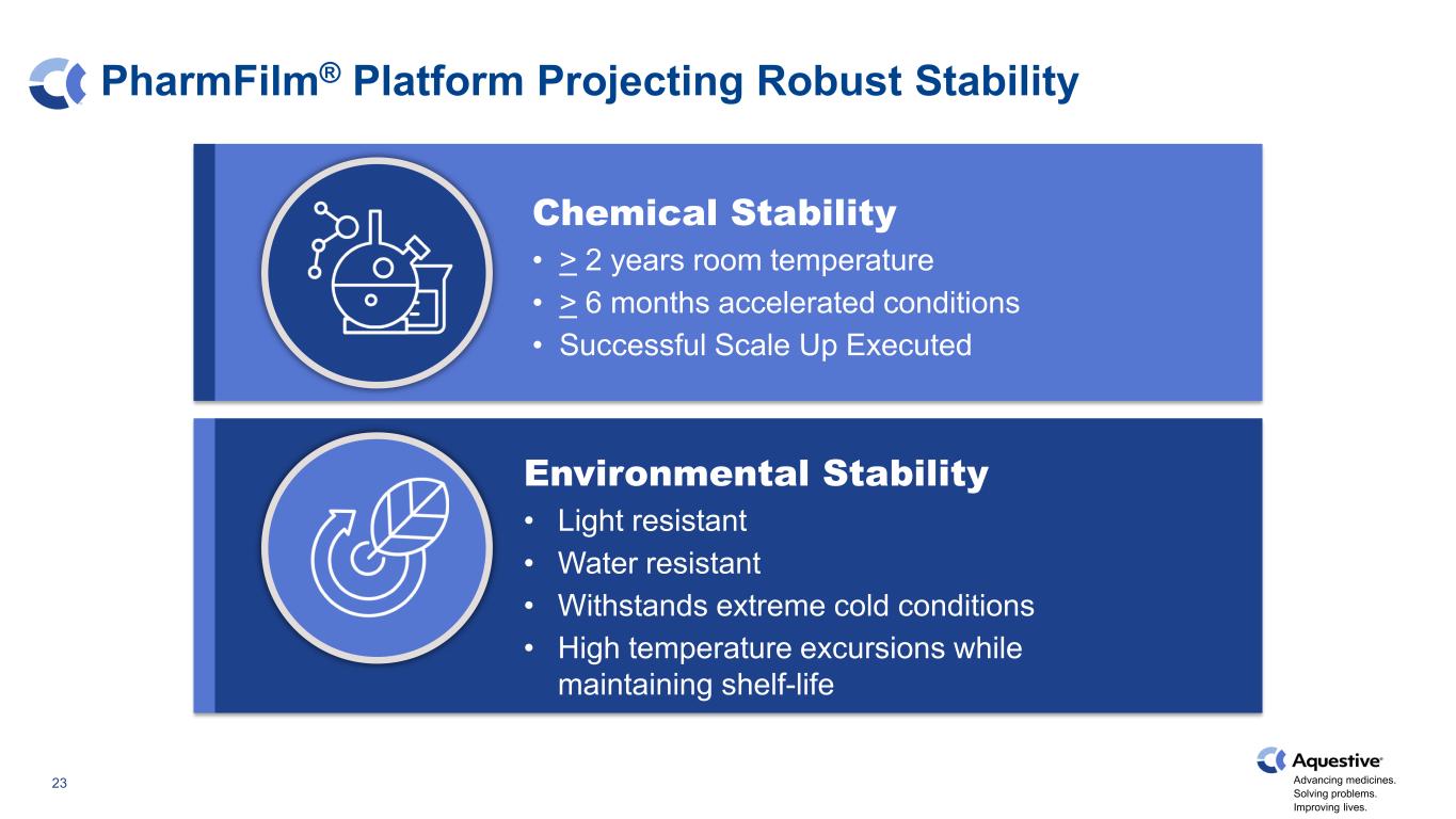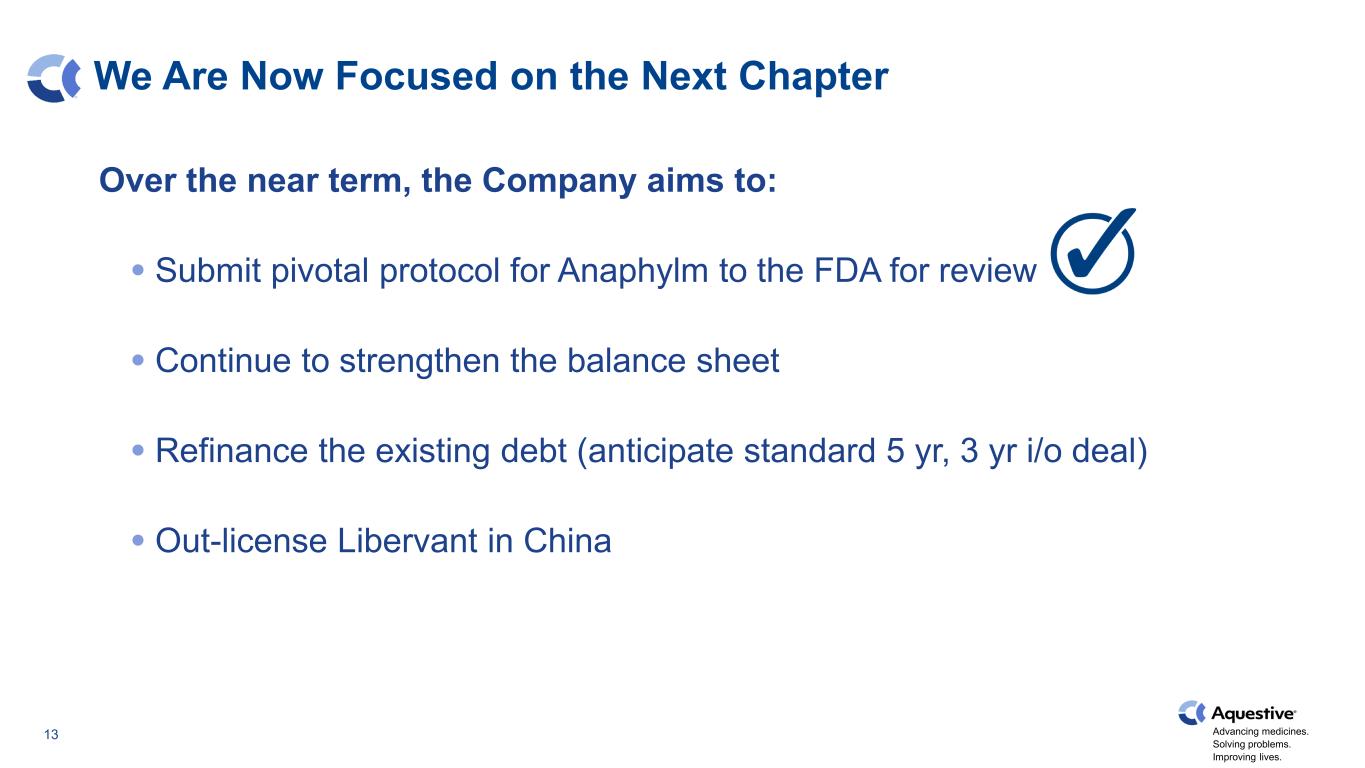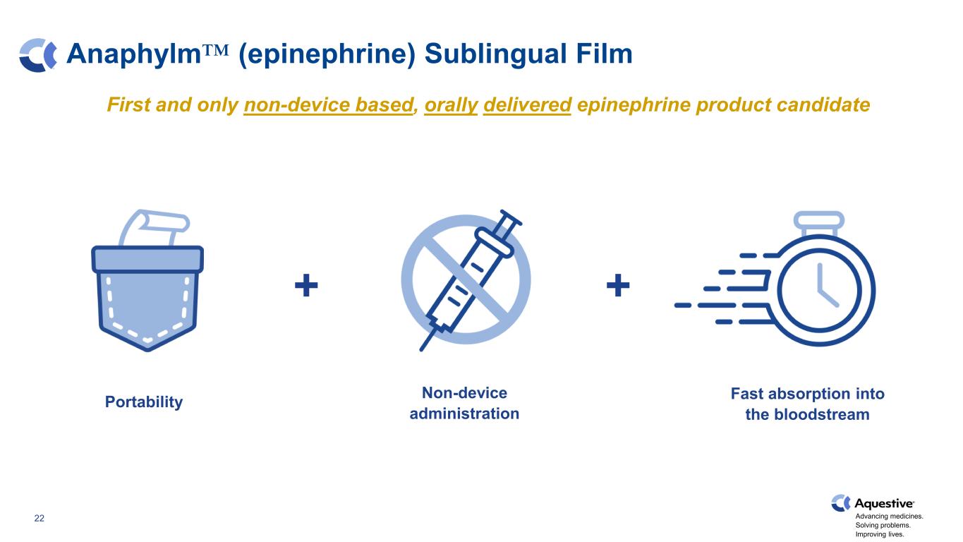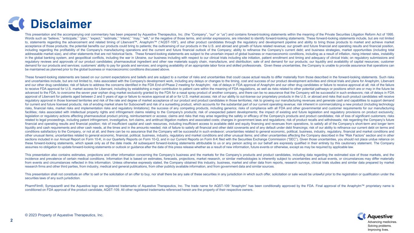 Advancing medicines. Solving problems. Improving lives. Disclaimer This presentation and the accompanying oral commentary has been prepared by Aquestive Therapeutics, Inc. (the “Company”, “our” or “us”) and contains forward-looking statements within the meaning of the Private Securities Litigation Reform Act of 1995. Words such as “believe,” “anticipate,” “plan,” “expect,” “estimate,” “intend,” “may,” “will,” or the negative of those terms, and similar expressions, are intended to identify forward-looking statements. These forward-looking statements include, but are not limited to, statements regarding the advancement and related timing of Libervant™, Anaphylm™ (“AQST-109”), and other product candidates through the regulatory and development pipeline and ability to bring those products to market and achieve market acceptance of those products; the potential benefits our products could bring to patients; the outlicensing of our products in the U.S. and abroad and growth of future related revenue; our growth and future financial and operating results and financial position, including regarding the profitability of the Company's manufacturing operations and the current and future financial outlook of the Company; ability to refinance the Company’s current debt; and business strategies, market opportunities (including total addressable market size), and other statements that are not historical facts. These forward-looking statements are subject to the uncertain impact of global business or macroeconomic conditions, including as a result of inflation, rising interest rates, instability in the global banking system, and geopolitical conflicts, including the war in Ukraine, our business including with respect to our clinical trials including site initiation, patient enrollment and timing and adequacy of clinical trials; on regulatory submissions and regulatory reviews and approvals of our product candidates; pharmaceutical ingredient and other raw materials supply chain, manufacture, and distribution; sale of and demand for our products; our liquidity and availability of capital resources; customer demand for our products and services; customers’ ability to pay for goods and services; and ongoing availability of an appropriate labor force and skilled professionals. Given these uncertainties, the Company is unable to provide assurance that operations can be maintained as planned prior to the global business or macroeconomic conditions discussed above. These forward-looking statements are based on our current expectations and beliefs and are subject to a number of risks and uncertainties that could cause actual results to differ materially from those described in the forward-looking statements. Such risks and uncertainties include, but are not limited to, risks associated with the Company's development work, including any delays or changes to the timing, cost and success of our product development activities and clinical trials and plans for Anaphylm, Libervant and our other drug candidates; risk of failure to address the concerns identified in the FDA End-of-Phase 2 meeting for Anaphylm; risk of delays in FDA approval of Anaphylm and our other drug candidates or failure to receive approval at all; risk of the failure to receive FDA approval for U.S. market access for Libervant, including by establishing a major contribution to patient care within the meaning of FDA regulations, as well as risks related to other potential pathways or positions which are or may in the future be advanced to the FDA, to overcome the seven year orphan drug market exclusivity granted by the FDA for a nasal spray product of another company, and there can be no assurance that the Company will be successful in such endeavors; risk of delays in FDA approval of Libervant for patients aged between 2 and 5 years of age or failure to receive approval at all or for U.S. market access; risk of our ability to out-license our proprietary products in the U.S. or abroad and risks that such product candidates will receive regulatory approval in those licensed territories and risk of the rate and degree of market acceptance of our product and product candidates in those territories; risk to growing our manufacturing revenues and generate cash and capabilities to support demand for current and future licensed products; risk of eroding market share for Suboxone® and risk of a sunsetting product, which accounts for the substantial part of our current operating revenue; risk inherent in commercializing a new product (including technology risks, financial risks, market risks and implementation risks and regulatory limitations); the success of any competing products, including generics; risks of compliance with all FDA and other governmental and customer requirements for our manufacturing facilities; risks associated with intellectual property rights and infringement claims relating to the Company's products; risk of unexpected patent developments; the impact of existing and future legislation and regulatory provisions on product exclusivity; legislation or regulatory actions affecting pharmaceutical product pricing, reimbursement or access; claims and risks that may arise regarding the safety or efficacy of the Company's products and product candidates; risk of loss of significant customers; risks related to legal proceedings, including patent infringement, investigative, tort claims, and antitrust litigation matters and associated costs; changes in government laws and regulations; risk of product recalls and withdrawals; risk regarding the Company’s future financial and operating results and financial position; risk of insufficient capital and cash resources, including insufficient access to available debt and equity financing and revenues from operations, to satisfy all of the Company’s short-term and longer term liquidity and cash requirements and other cash needs, at the tim