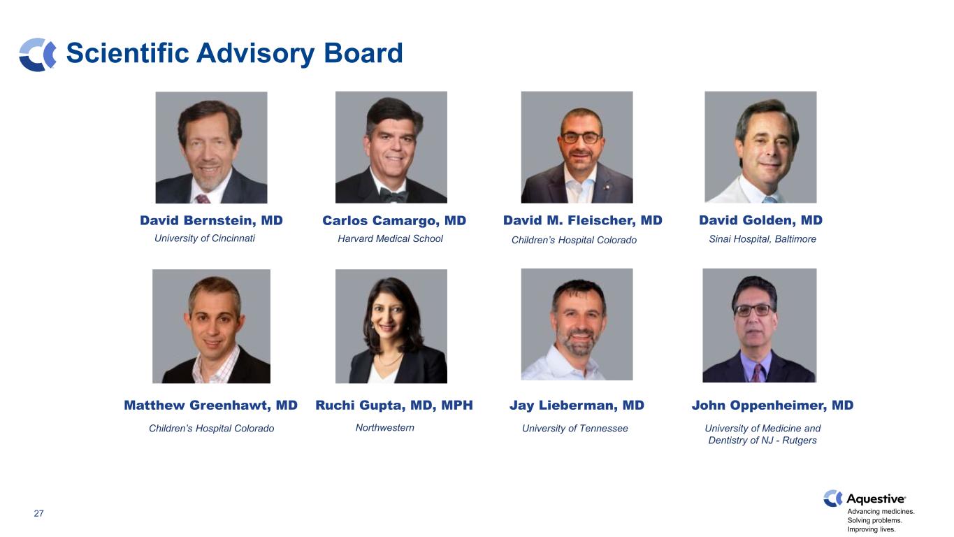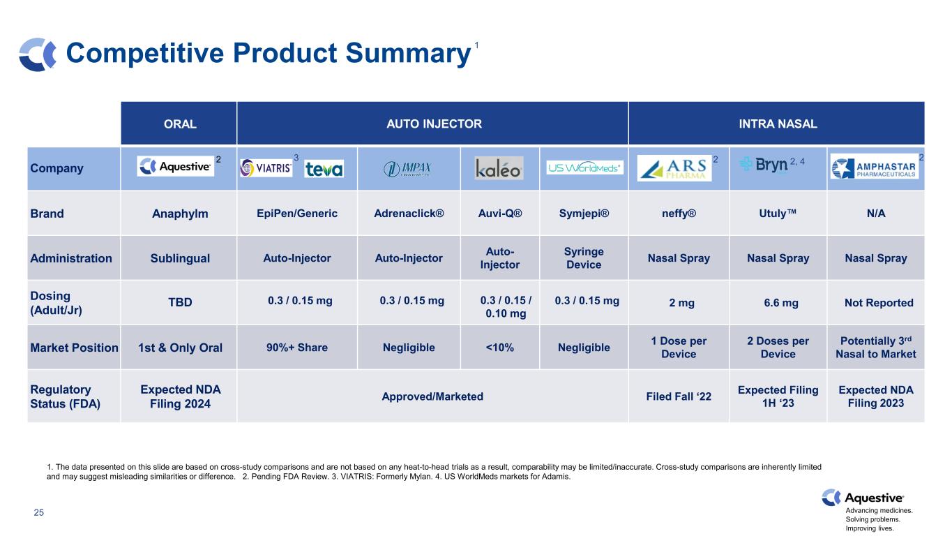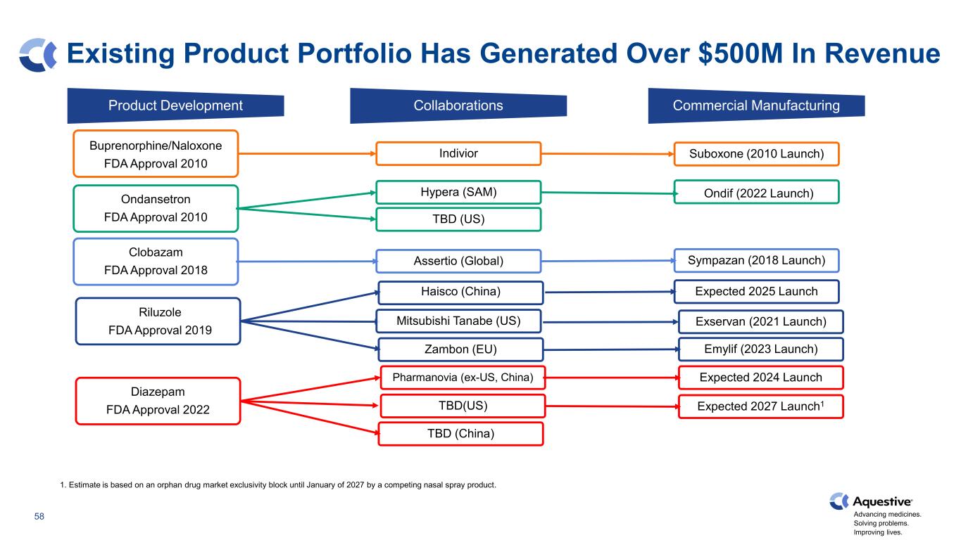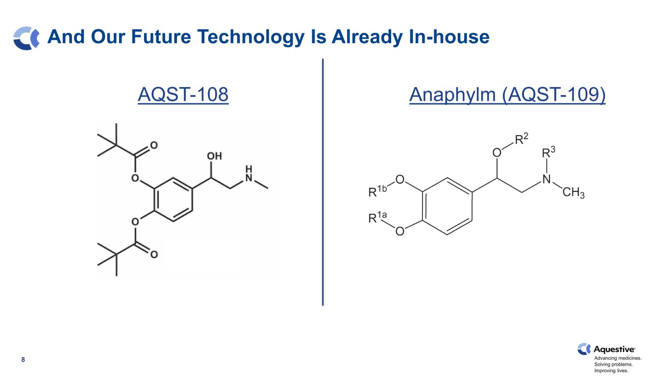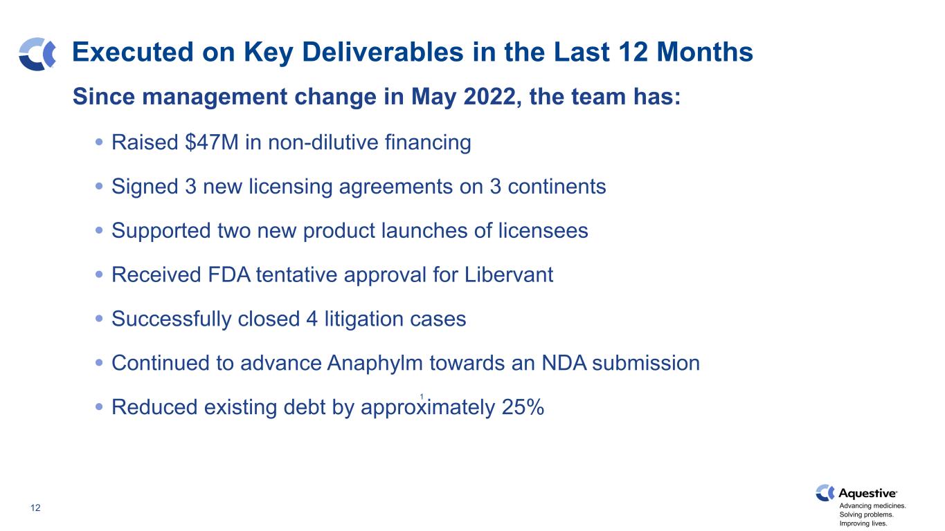 Advancing medicines. Solving problems. Improving lives. Disclaimer This presentation and the accompanying oral commentary has been prepared by Aquestive Therapeutics, Inc. (the “Company”, “our” or “us”) and contains forward-looking statements within the meaning of the Private Securities Litigation Reform Act of 1995. Words such as “believe,” “anticipate,” “plan,” “expect,” “estimate,” “intend,” “may,” “will,” or the negative of those terms, and similar expressions, are intended to identify forward-looking statements. These forward-looking statements include, but are not limited to, statements regarding the advancement and related timing of Libervant™, Anaphylm™ (“AQST-109”), and other product candidates through the regulatory and development pipeline and ability to bring those products to market and achieve market acceptance of those products; the potential benefits our products could bring to patients; the outlicensing of our products in the U.S. and abroad and growth of future related revenue; our growth and future financial and operating results and financial position, including regarding the profitability of the Company's manufacturing operations and the current and future financial outlook of the Company; ability to refinance the Company’s current debt; and business strategies, market opportunities (including total addressable market size), and other statements that are not historical facts. These forward-looking statements are subject to the uncertain impact of global business or macroeconomic conditions, including as a result of inflation, rising interest rates, instability in the global banking system, and geopolitical conflicts, including the war in Ukraine, our business including with respect to our clinical trials including site initiation, patient enrollment and timing and adequacy of clinical trials; on regulatory submissions and regulatory reviews and approvals of our product candidates; pharmaceutical ingredient and other raw materials supply chain, manufacture, and distribution; sale of and demand for our products; our liquidity and availability of capital resources; customer demand for our products and services; customers’ ability to pay for goods and services; and ongoing availability of an appropriate labor force and skilled professionals. Given these uncertainties, the Company is unable to provide assurance that operations can be maintained as planned prior to the global business or macroeconomic conditions discussed above. These forward-looking statements are based on our current expectations and beliefs and are subject to a number of risks and uncertainties that could cause actual results to differ materially from those described in the forward-looking statements. Such risks and uncertainties include, but are not limited to, risks associated with the Company's development work, including any delays or changes to the timing, cost and success of our product development activities and clinical trials and plans for Anaphylm, Libervant and our other drug candidates; risk of failure to address the concerns identified in the FDA End-of-Phase 2 meeting for Anaphylm; risk of delays in FDA approval of Anaphylm and our other drug candidates or failure to receive approval at all; risk of the failure to receive FDA approval for U.S. market access for Libervant, including by establishing a major contribution to patient care within the meaning of FDA regulations, as well as risks related to other potential pathways or positions which are or may in the future be advanced to the FDA, to overcome the seven year orphan drug market exclusivity granted by the FDA for a nasal spray product of another company, and there can be no assurance that the Company will be successful in such endeavors; risk of delays in FDA approval of Libervant for patients aged between 2 and 5 years of age or failure to receive approval at all or for U.S. market access; risk of our ability to out-license our proprietary products in the U.S. or abroad and risks that such product candidates will receive regulatory approval in those licensed territories and risk of the rate and degree of market acceptance of our product and product candidates in those territories; risk to growing our manufacturing revenues and generate cash and capabilities to support demand for current and future licensed products; risk of eroding market share for Suboxone® and risk of a sunsetting product, which accounts for the substantial part of our current operating revenue; risk inherent in commercializing a new product (including technology risks, financial risks, market risks and implementation risks and regulatory limitations); the success of any competing products, including generics; risks of compliance with all FDA and other governmental and customer requirements for our manufacturing facilities; risks associated with intellectual property rights and infringement claims relating to the Company's products; risk of unexpected patent developments; the impact of existing and future legislation and regulatory provisions on product exclusivity; legislation or regulatory actions affecting pharmaceutical product pricing, reimbursement or access; claims and risks that may arise regarding the safety or efficacy of the Company's products and product candidates; risk of loss of significant customers; risks related to legal proceedings, including patent infringement, investigative, tort claims, and antitrust litigation matters and associated costs; changes in government laws and regulations; risk of product recalls and withdrawals; risk regarding the Company’s future financial and operating results and financial position; risk of insufficient capital and cash resources, including insufficient access to available debt and equity financing and revenues from operations, to satisfy all of the Company’s short-term and longer term liquidity and cash requirements and other cash needs, at the tim