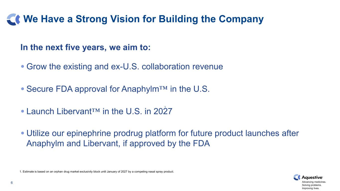 Advancing medicines. Solving problems. Improving lives. Aquestive Is a Growth Story With Multiple Assets 5 Revenue-Generating Base of Existing Collaborations • 5 FDA-approved products • 10+ years of product sales on 6 continents • Multiple product launches since 2022 • 150+ patents worldwide Potential for 2 Commercialization Events in or Prior to 2027 • Lead pipeline product candidate is Anaphylm™ (epinephrine) sublingual film • First and only non-device based, oral product candidate for the emergency treatment of severe allergic reactions, including anaphylaxis • Anticipate filing for FDA approval in 2024 • Received FDA tentative approval of Libervant™ (diazepam) buccal film for the treatment of seizure clusters in patients aged 12 and older with epilepsy • Anticipate launch in 2027 (based on scheduled expiration of orphan drug block), or sooner if approved by FDA Pipeline Renewal Will Come From In-house Technology • Epinephrine prodrug platform has the potential for multiple future pipeline iterations and indications