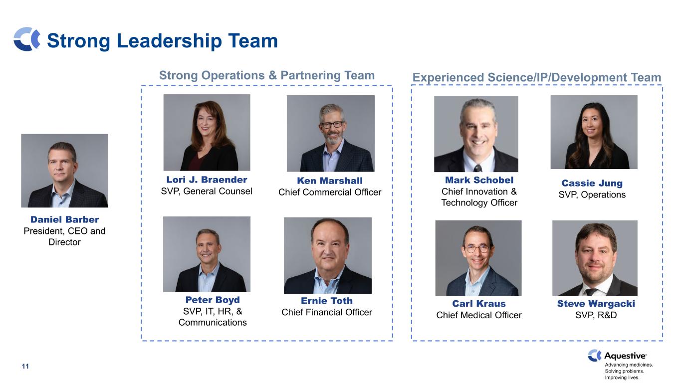 Advancing medicines. Solving problems. Improving lives. Potential for Two Transformative Launches 10 Anaphylm™ (epinephrine) Sublingual Film • Potential indication of treatment of severe allergic reactions, including anaphylaxis • Anticipate submitting New Drug Application (NDA) by the end of 2024 • Estimated Total Addressable Market of ~ $1B 1. Estimated total addressable market is an Aquestive Therapeutic’s calculations based on (i) WAC Price for generic EipPen as of March 2020 and (ii) epinephrine market TRx volume as of December 2022. 2. Estimate is based on an orphan drug market exclusivity block until January of 2027 by a competing nasal spray product. Libervant™ (diazepam) Buccal Film • Indicated for the treatment of seizure clusters in patients aged 12 and older with epilepsy • Tentatively approved by FDA • Expected Launch 2027 1 2