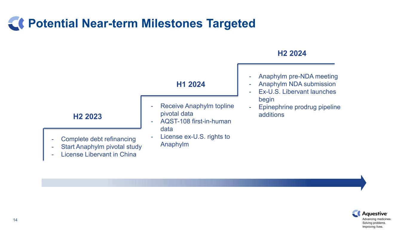 Advancing medicines. Solving problems. Improving lives. 14 Potential Near-term Milestones Targeted - Complete debt refinancing - Start Anaphylm pivotal study - License Libervant in China H1 2024 - Receive Anaphylm topline pivotal data - AQST-108 first-in-human data - License ex-U.S. rights to Anaphylm H2 2023 - Anaphylm pre-NDA meeting - Anaphylm NDA submission - Ex-U.S. Libervant launches begin - Epinephrine prodrug pipeline additions H2 2024