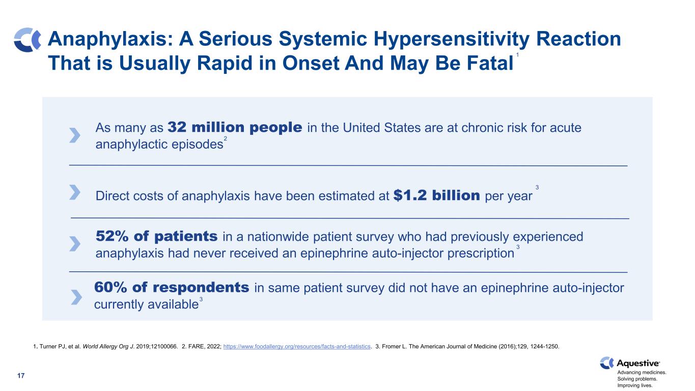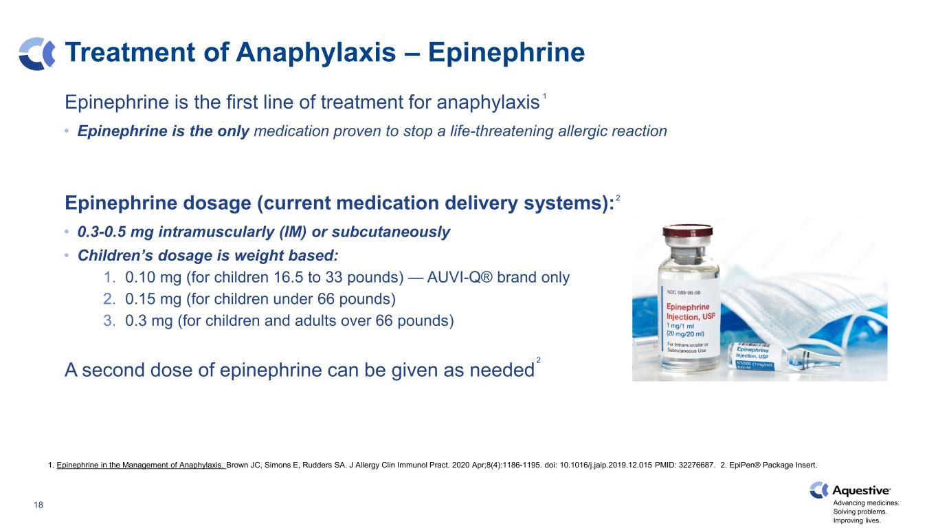 Advancing medicines. Solving problems. Improving lives. Anaphylaxis: A Serious Systemic Hypersensitivity Reaction That is Usually Rapid in Onset And May Be Fatal 17 1. Turner PJ, et al. World Allergy Org J. 2019;12100066. 2. FARE, 2022; https://www.foodallergy.org/resources/facts-and-statistics. 3. Fromer L. The American Journal of Medicine (2016);129, 1244-1250. As many as 32 million people in the United States are at chronic risk for acute anaphylactic episodes 52% of patients in a nationwide patient survey who had previously experienced anaphylaxis had never received an epinephrine auto-injector prescription Direct costs of anaphylaxis have been estimated at $1.2 billion per year 60% of respondents in same patient survey did not have an epinephrine auto-injector currently available 1 2 3 3 3