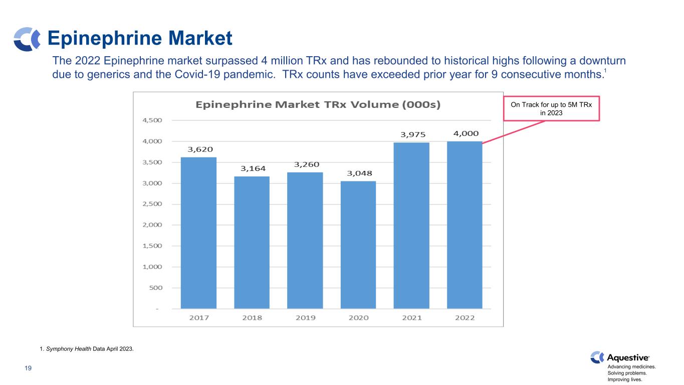 Advancing medicines. Solving problems. Improving lives. 19 Epinephrine Market On Track for up to 5M TRx in 2023 1. Symphony Health Data April 2023. The 2022 Epinephrine market surpassed 4 million TRx and has rebounded to historical highs following a downturn due to generics and the Covid-19 pandemic. TRx counts have exceeded prior year for 9 consecutive months.1