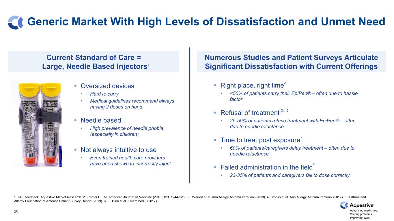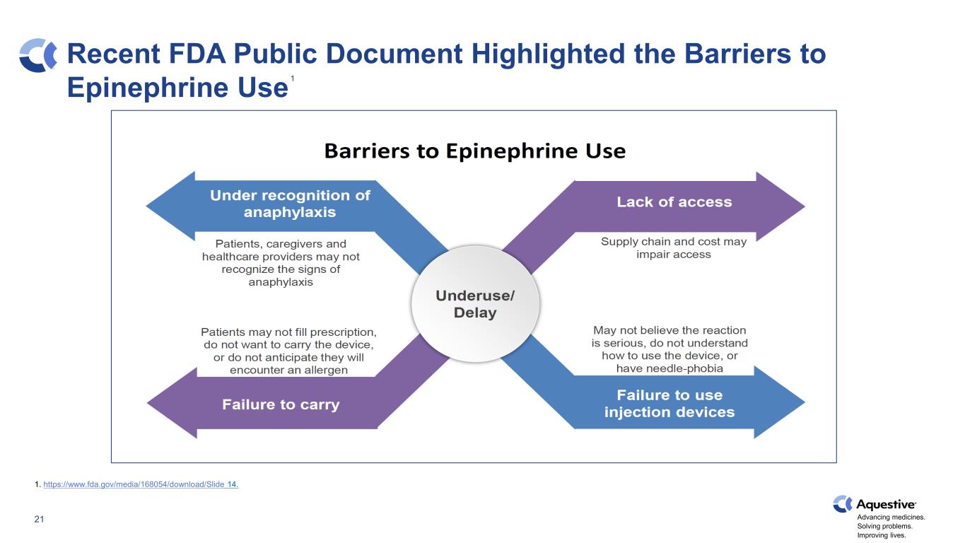 Advancing medicines. Solving problems. Improving lives. 20 Generic Market With High Levels of Dissatisfaction and Unmet Need 1. KOL feedback; Aquestive Market Research. 2. Fromer L. The American Journal of Medicine (2016);129, 1244-1250. 3. Warren et al. Ann Allergy Asthma Immunol (2018). 4. Brooks et al. Ann Allergy Asthma Immunol (2017). 5. Asthma and Allergy Foundation of America Patient Survey Report (2019). 6. El Turki et al. EmergMed J (2017). Current Standard of Care = Large, Needle Based Injectors Numerous Studies and Patient Surveys Articulate Significant Dissatisfaction with Current Offerings • Right place, right time • <50% of patients carry their EpiPen® – often due to hassle factor • Refusal of treatment • 25-50% of patients refuse treatment with EpiPen® – often due to needle reluctance • Time to treat post exposure • 60% of patients/caregivers delay treatment – often due to needle reluctance • Failed administration in the field • 23-35% of patients and caregivers fail to dose correctly • Oversized devices • Hard to carry • Medical guidelines recommend always having 2 doses on hand • Needle based • High prevalence of needle phobia (especially in children) • Not always intuitive to use • Even trained health care providers have been shown to incorrectly inject 3,4,5 1 1 6 2