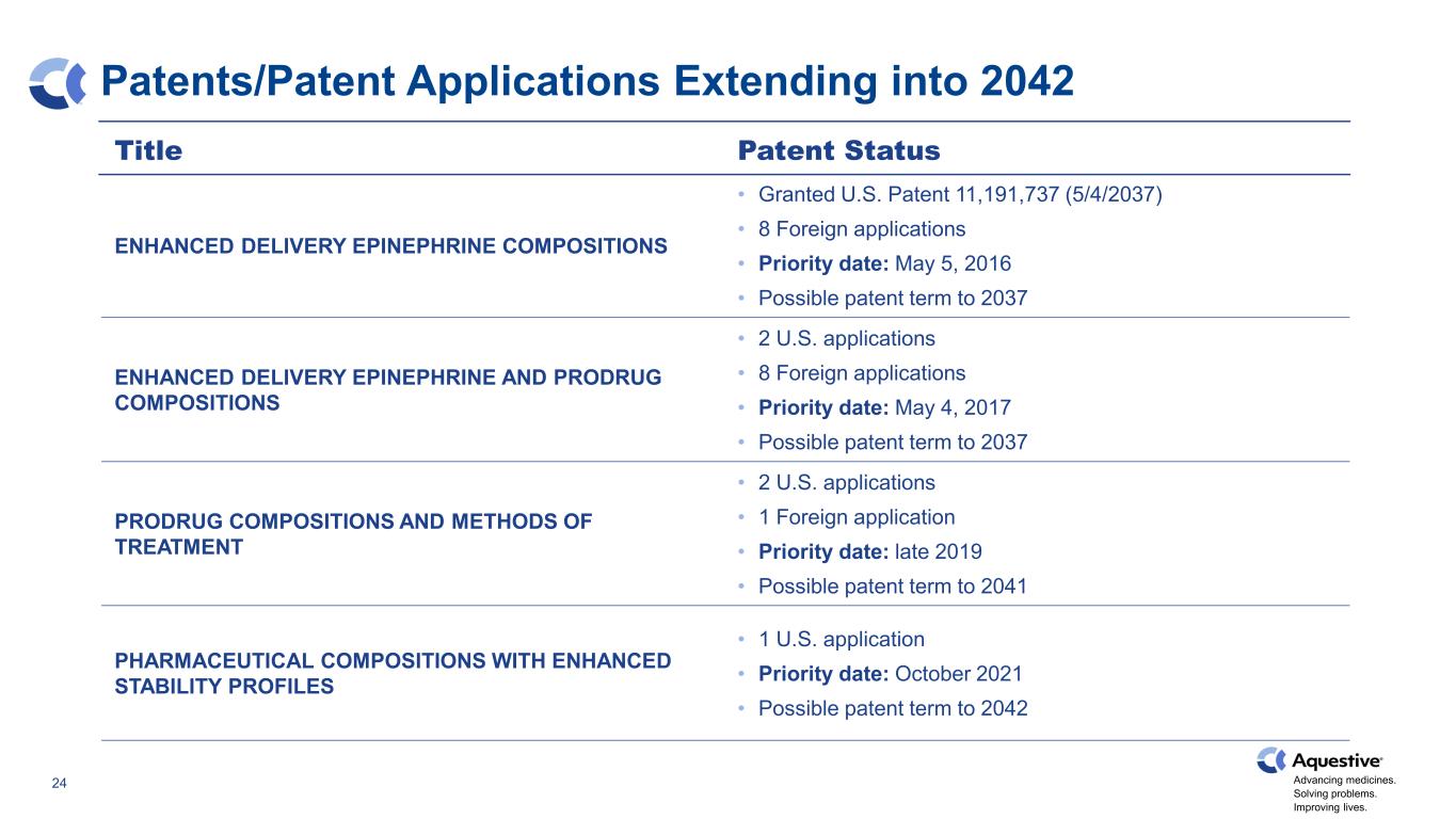 Advancing medicines. Solving problems. Improving lives. 24 Patents/Patent Applications Extending into 2042 Title Patent Status ENHANCED DELIVERY EPINEPHRINE COMPOSITIONS • Granted U.S. Patent 11,191,737 (5/4/2037) • 8 Foreign applications • Priority date: May 5, 2016 • Possible patent term to 2037 ENHANCED DELIVERY EPINEPHRINE AND PRODRUG COMPOSITIONS • 2 U.S. applications • 8 Foreign applications • Priority date: May 4, 2017 • Possible patent term to 2037 PRODRUG COMPOSITIONS AND METHODS OF TREATMENT • 2 U.S. applications • 1 Foreign application • Priority date: late 2019 • Possible patent term to 2041 PHARMACEUTICAL COMPOSITIONS WITH ENHANCED STABILITY PROFILES • 1 U.S. application • Priority date: October 2021 • Possible patent term to 2042