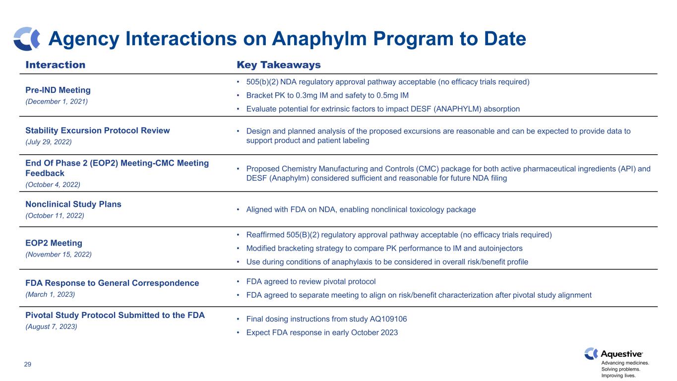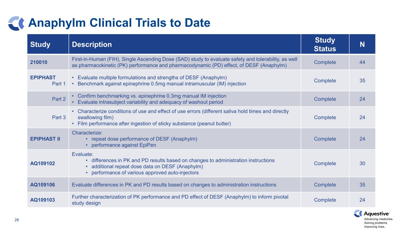 Advancing medicines. Solving problems. Improving lives. 28 Anaphylm Clinical Trials to Date Study Description Study Status N 210010 First-in-Human (FIH), Single Ascending Dose (SAD) study to evaluate safety and tolerability, as well as pharmacokinetic (PK) performance and pharmacodynamic (PD) effect, of DESF (Anaphylm) Complete 44 EPIPHAST Part 1 • Evaluate multiple formulations and strengths of DESF (Anaphylm) • Benchmark against epinephrine 0.5mg manual intramuscular (IM) injection Complete 35 Part 2 • Confirm benchmarking vs. epinephrine 0.3mg manual IM injection • Evaluate intrasubject variability and adequacy of washout period Complete 24 Part 3 • Characterize conditions of use and effect of use errors (different saliva hold times and directly swallowing film) • Film performance after ingestion of sticky substance (peanut butter) Complete 24 EPIPHAST II Characterize: • repeat dose performance of DESF (Anaphylm) • performance against EpiPen Complete 24 AQ109102 Evaluate: • differences in PK and PD results based on changes to administration instructions • additional repeat dose data on DESF (Anaphylm) • performance of various approved auto-injectors Complete 30 AQ109106 Evaluate differences in PK and PD results based on changes to administration instructions Complete 35 AQ109103 Further characterization of PK performance and PD effect of DESF (Anaphylm) to inform pivotal study design Complete 24
