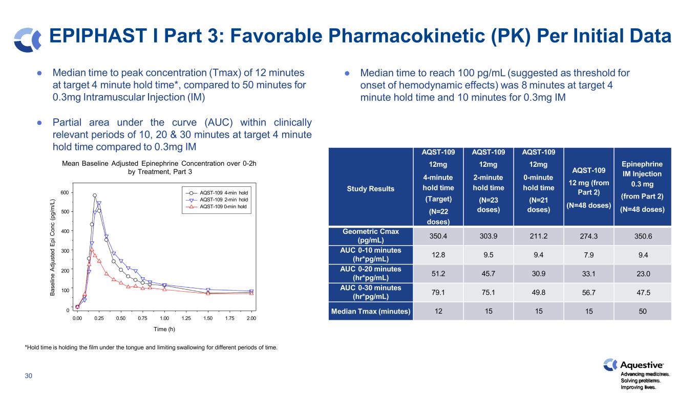 Advancing medicines. Solving problems. Improving lives. 29 Agency Interactions on Anaphylm Program to Date Interaction Key Takeaways Pre-IND Meeting (December 1, 2021) • 505(b)(2) NDA regulatory approval pathway acceptable (no efficacy trials required) • Bracket PK to 0.3mg IM and safety to 0.5mg IM • Evaluate potential for extrinsic factors to impact DESF (ANAPHYLM) absorption Stability Excursion Protocol Review (July 29, 2022) • Design and planned analysis of the proposed excursions are reasonable and can be expected to provide data to support product and patient labeling End Of Phase 2 (EOP2) Meeting-CMC Meeting Feedback (October 4, 2022) • Proposed Chemistry Manufacturing and Controls (CMC) package for both active pharmaceutical ingredients (API) and DESF (Anaphylm) considered sufficient and reasonable for future NDA filing Nonclinical Study Plans (October 11, 2022) • Aligned with FDA on NDA, enabling nonclinical toxicology package EOP2 Meeting (November 15, 2022) • Reaffirmed 505(B)(2) regulatory approval pathway acceptable (no efficacy trials required) • Modified bracketing strategy to compare PK performance to IM and autoinjectors • Use during conditions of anaphylaxis to be considered in overall risk/benefit profile FDA Response to General Correspondence (March 1, 2023) • FDA agreed to review pivotal protocol • FDA agreed to separate meeting to align on risk/benefit characterization after pivotal study alignment Pivotal Study Protocol Submitted to the FDA (August 7, 2023) • Final dosing instructions from study AQ109106 • Expect FDA response in early October 2023