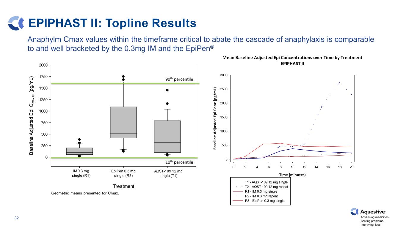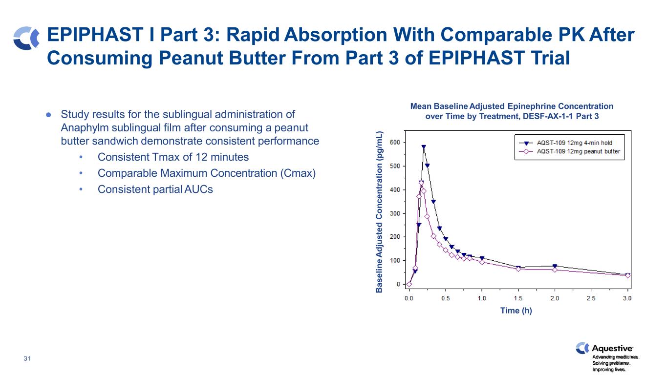 Advancing medicines. Solving problems. Improving lives. 30 EPIPHAST I Part 3: Favorable Pharmacokinetic (PK) Per Initial Data ● Median time to peak concentration (Tmax) of 12 minutes at target 4 minute hold time*, compared to 50 minutes for 0.3mg Intramuscular Injection (IM) ● Partial area under the curve (AUC) within clinically relevant periods of 10, 20 & 30 minutes at target 4 minute hold time compared to 0.3mg IM Mean Baseline Adjusted Epinephrine Concentration over 0-2h by Treatment, Part 3 ● Median time to reach 100 pg/mL (suggested as threshold for onset of hemodynamic effects) was 8 minutes at target 4 minute hold time and 10 minutes for 0.3mg IM *Hold time is holding the film under the tongue and limiting swallowing for different periods of time. Study Results AQST-109 12mg 4-minute hold time (Target) (N=22 doses) AQST-109 12mg 2-minute hold time (N=23 doses) AQST-109 12mg 0-minute hold time (N=21 doses) AQST-109 12 mg (from Part 2) (N=48 doses) Epinephrine IM Injection 0.3 mg (from Part 2) (N=48 doses) Geometric Cmax (pg/mL) 350.4 303.9 211.2 274.3 350.6 AUC 0-10 minutes (hr*pg/mL) 12.8 9.5 9.4 7.9 9.4 AUC 0-20 minutes (hr*pg/mL) 51.2 45.7 30.9 33.1 23.0 AUC 0-30 minutes (hr*pg/mL) 79.1 75.1 49.8 56.7 47.5 Median Tmax (minutes) 12 15 15 15 50 0.75 1.00 1.25 Time (h) 0.00 0.25 0.50 1.50 1.75 2.00 Ba se lin e Ad ju st ed E pi C on c (p g/ m /L ) i icines. l i r le s. li . 500 400 300 200 100 0 600 AQST-109 4-min hold AQST-109 2-min hold AQST-109 0-min hold