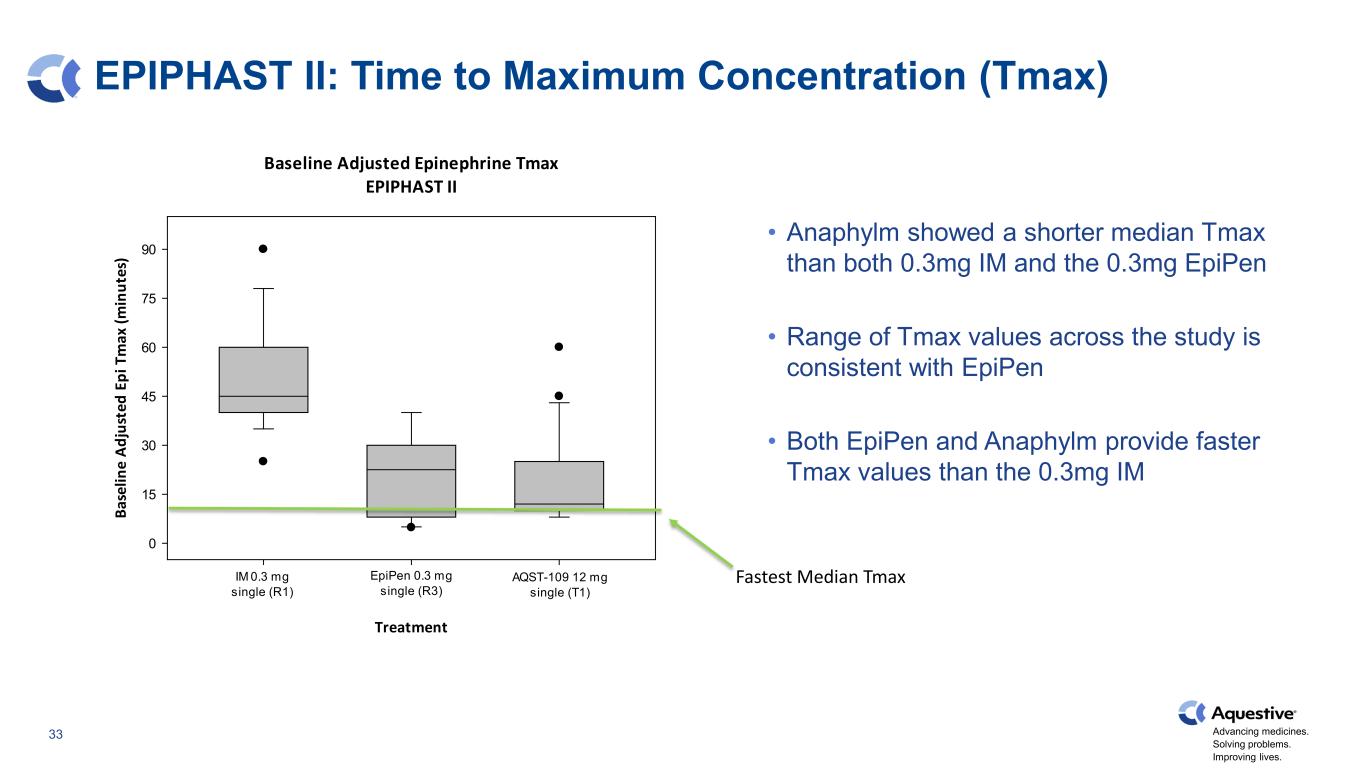 Advancing medicines. Solving problems. Improving lives. 32 Treatment B as el in e A dj us te d E pi C m ax 15 (p g/ m L) 0 250 500 750 1000 1250 1500 1750 2000 IM 0.3 mg single (R1) EpiPen 0.3 mg single (R3) AQST-109 12 mg single (T1) EPIPHAST II: Topline Results Geometric means presented for Cmax. Anaphylm Cmax values within the timeframe critical to abate the cascade of anaphylaxis is comparable to and well bracketed by the 0.3mg IM and the EpiPen® 90th percentile 10th percentile Mean Baseline Adjusted Epi Concentrations over Time by Treatment EPIPHAST II Time (minutes) 0 2 4 6 8 10 12 14 16 18 20 Ba se lin e Ad ju st ed E pi C on c (p g/ m L) 0 500 1000 1500 2000 2500 3000 T1 - AQST-109 12 mg single T2 - AQST-109 12 mg repeat R1 - IM 0.3 mg single R2 - IM 0.3 mg repeat R3 - EpiPen 0.3 mg single