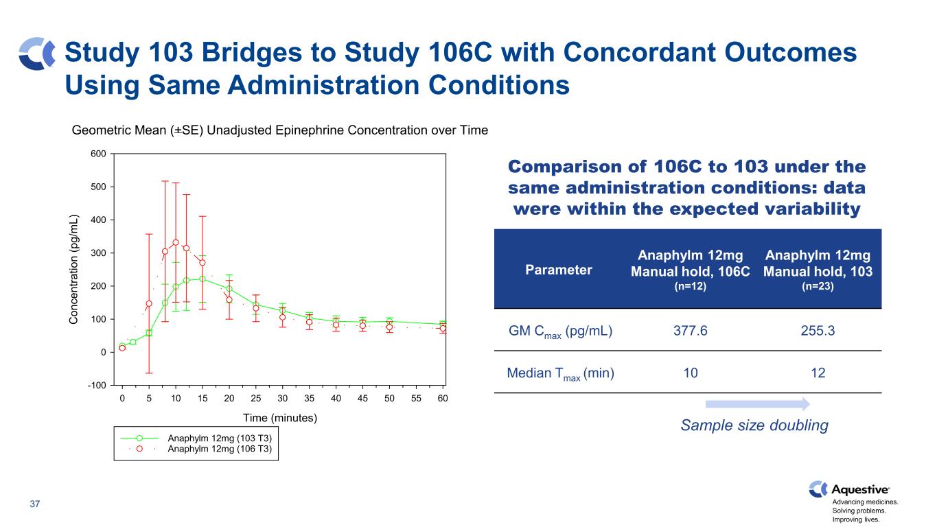 Advancing medicines. Solving problems. Improving lives. Study AQ109103 Design and Objective DESIGN • Single-center, 3-way crossover • N = 24 healthy volunteers • Treatments o T1 = Anaphylm 12mg “revised administration language” o T2 = Anaphylm 14mg “revised administration language” o T3 = Anaphylm 12mg “repeat of Study AQ109106C dosing instructions” OBJECTIVE • Evaluate intended dosing instructions relative to Study AQ109106C and previously studied comparators 36