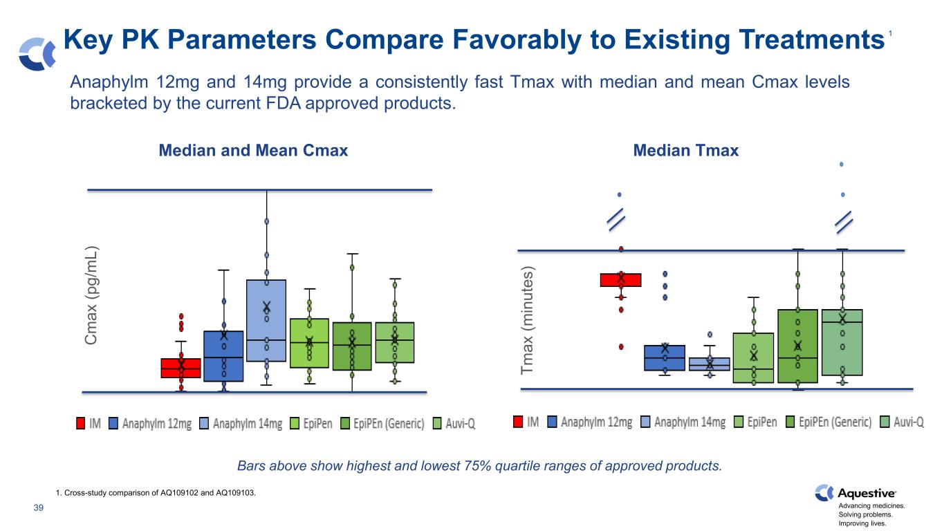 Advancing medicines. Solving problems. Improving lives. 38 0 50 100 150 200 250 300 350 AUC0-5min AUC0-10min AUC0-20min AUC0-30min AUC0-40min AUC0-45min AUC0-60min Ep in ep hr in e Ex po su re L ev el s (h r* pg /m L) Time Post Administration (minutes) pAUC Comparison of Anaphylm 12mg and 14mg to Combined Auto-Injectors 0.3mg and Adrenalin (epinephrine) Manual Injection 0.3mg Anaphylm 12mg and 14mg Exceeds Lower Bracket at All Expected Pivotal Targets Manual Injection Level and Below Anaphylm 12mgCritical early time points similar to auto- injectors Partial AUC (%CV) Manual Injection Anaphylm 12mg Anaphylm 14mg AUC0-45min 94.4 (75.6%) 127.6 (124.2%) 222.2 (105.3%) AUC0-50min 117.2 (72.3%) 138.1 (122.4%) 232.1 (104.6%) AUC0-60min 160.4 (66.2%) 156.5 (119.4%) 251.7 (103.0%) 1 1. Bracketing end points subject to alignment with FDA. Cross-study comparison from AQ109102 and AQ109103. Anaphylm 14mg