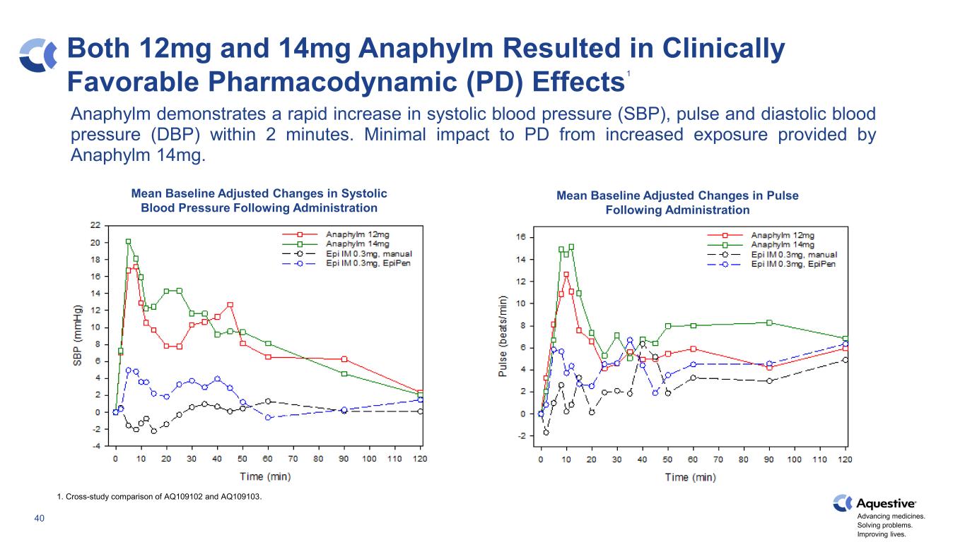 Advancing medicines. Solving problems. Improving lives. 39 Key PK Parameters Compare Favorably to Existing Treatments Bars above show highest and lowest 75% quartile ranges of approved products. 1. Cross-study comparison of AQ109102 and AQ109103. Anaphylm 12mg and 14mg provide a consistently fast Tmax with median and mean Cmax levels bracketed by the current FDA approved products. Median and Mean Cmax Median Tmax Tm ax (m in ut es ) C m ax (p g/ m L) 1