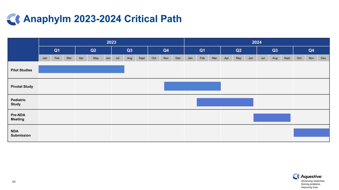 Advancing medicines. Solving problems. Improving lives. 44 Anaphylm 2023-2024 Critical Path 2023 2024 Q1 Q2 Q3 Q4 Q1 Q2 Q3 Q4 Jan Feb Mar Apr May Jun Jul Aug Sept Oct Nov Dec Jan Feb Mar Apr May Jun Jul Aug Sept Oct Nov Dec Pilot Studies Pivotal Study Pediatric Study Pre-NDA Meeting NDA Submission