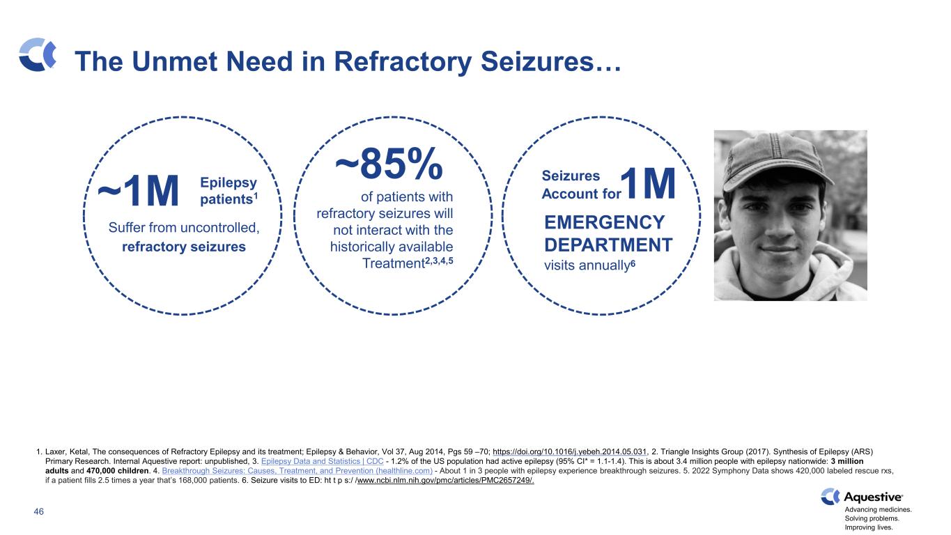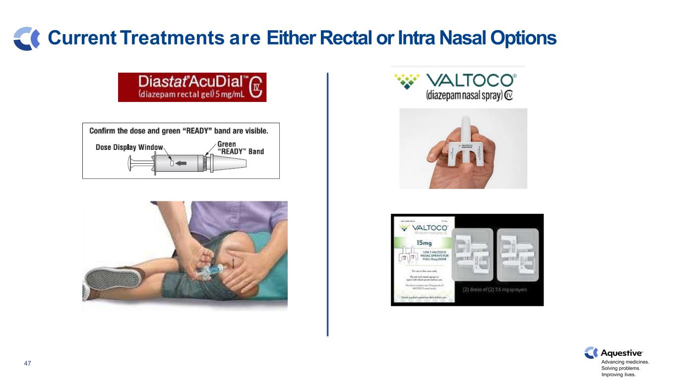 Advancing medicines. Solving problems. Improving lives. 46 1. Laxer, Ketal, The consequences of Refractory Epilepsy and its treatment; Epilepsy & Behavior, Vol 37, Aug 2014, Pgs 59 –70; https://doi.org/10.1016/j.yebeh.2014.05.031, 2. Triangle Insights Group (2017). Synthesis of Epilepsy (ARS) Primary Research. Internal Aquestive report: unpublished, 3. Epilepsy Data and Statistics | CDC - 1.2% of the US population had active epilepsy (95% CI* = 1.1-1.4). This is about 3.4 million people with epilepsy nationwide: 3 million adults and 470,000 children. 4. Breakthrough Seizures: Causes, Treatment, and Prevention (healthline.com) - About 1 in 3 people with epilepsy experience breakthrough seizures. 5. 2022 Symphony Data shows 420,000 labeled rescue rxs, if a patient fills 2.5 times a year that’s 168,000 patients. 6. Seizure visits to ED: ht t p s:/ /www.ncbi.nlm.nih.gov/pmc/articles/PMC2657249/. The Unmet Need in Refractory Seizures… ~1M Suffer from uncontrolled, refractory seizures Epilepsy patients1 1MSeizures Account for EMERGENCY DEPARTMENT visits annually6 of patients with refractory seizures will not interact with the historically available Treatment2,3,4,5 ~85%