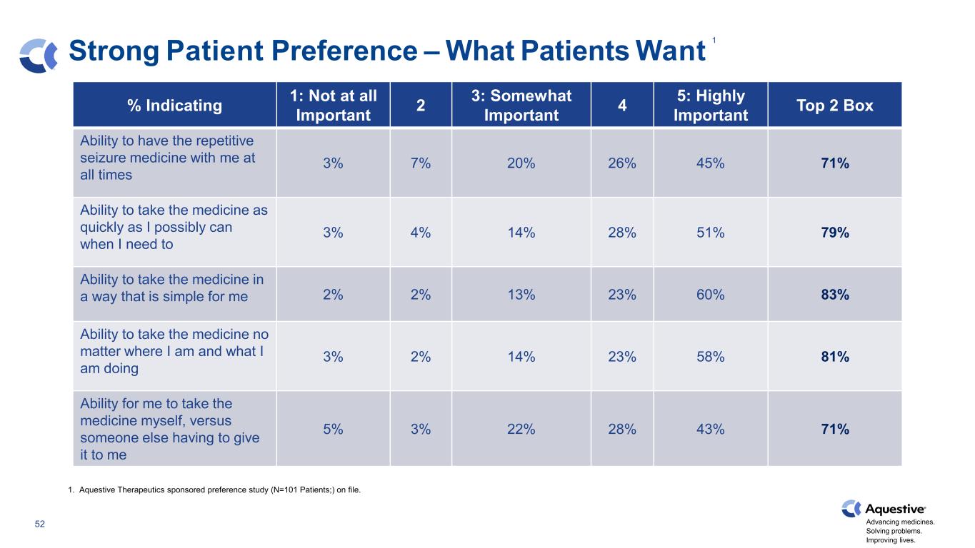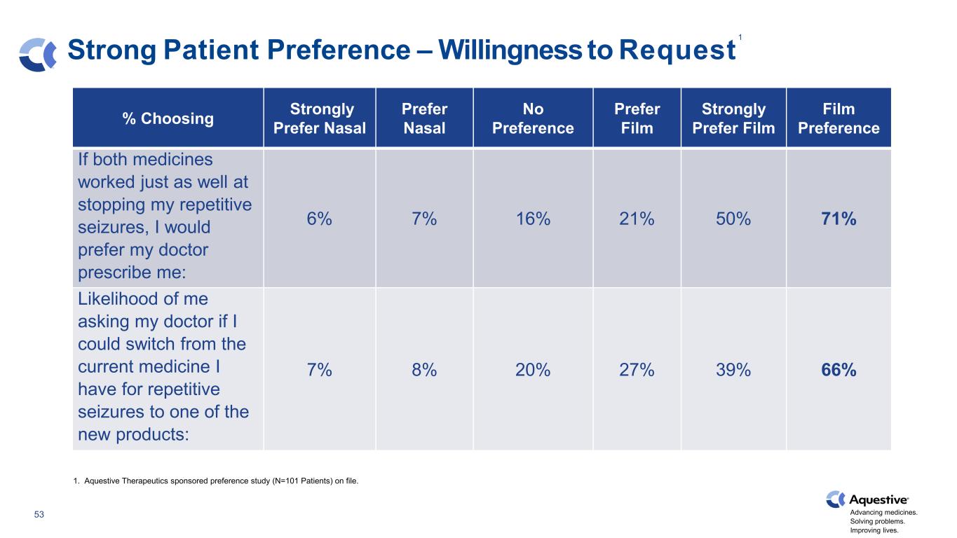Advancing medicines. Solving problems. Improving lives. 52 Strong Patient Preference – What Patients Want % Indicating 1: Not at all Important 2 3: Somewhat Important 4 5: Highly Important Top 2 Box Ability to have the repetitive seizure medicine with me at all times 3% 7% 20% 26% 45% 71% Ability to take the medicine as quickly as I possibly can when I need to 3% 4% 14% 28% 51% 79% Ability to take the medicine in a way that is simple for me 2% 2% 13% 23% 60% 83% Ability to take the medicine no matter where I am and what I am doing 3% 2% 14% 23% 58% 81% Ability for me to take the medicine myself, versus someone else having to give it to me 5% 3% 22% 28% 43% 71% 1. Aquestive Therapeutics sponsored preference study (N=101 Patients;) on file. 1