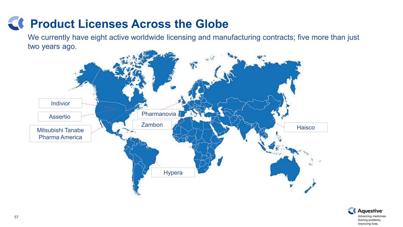 Advancing medicines. Solving problems. Improving lives. 57 Product Licenses Across the Globe Indivior Assertio Hypera Haisco Pharmanovia Zambon Mitsubishi Tanabe Pharma America We currently have eight active worldwide licensing and manufacturing contracts; five more than just two years ago.