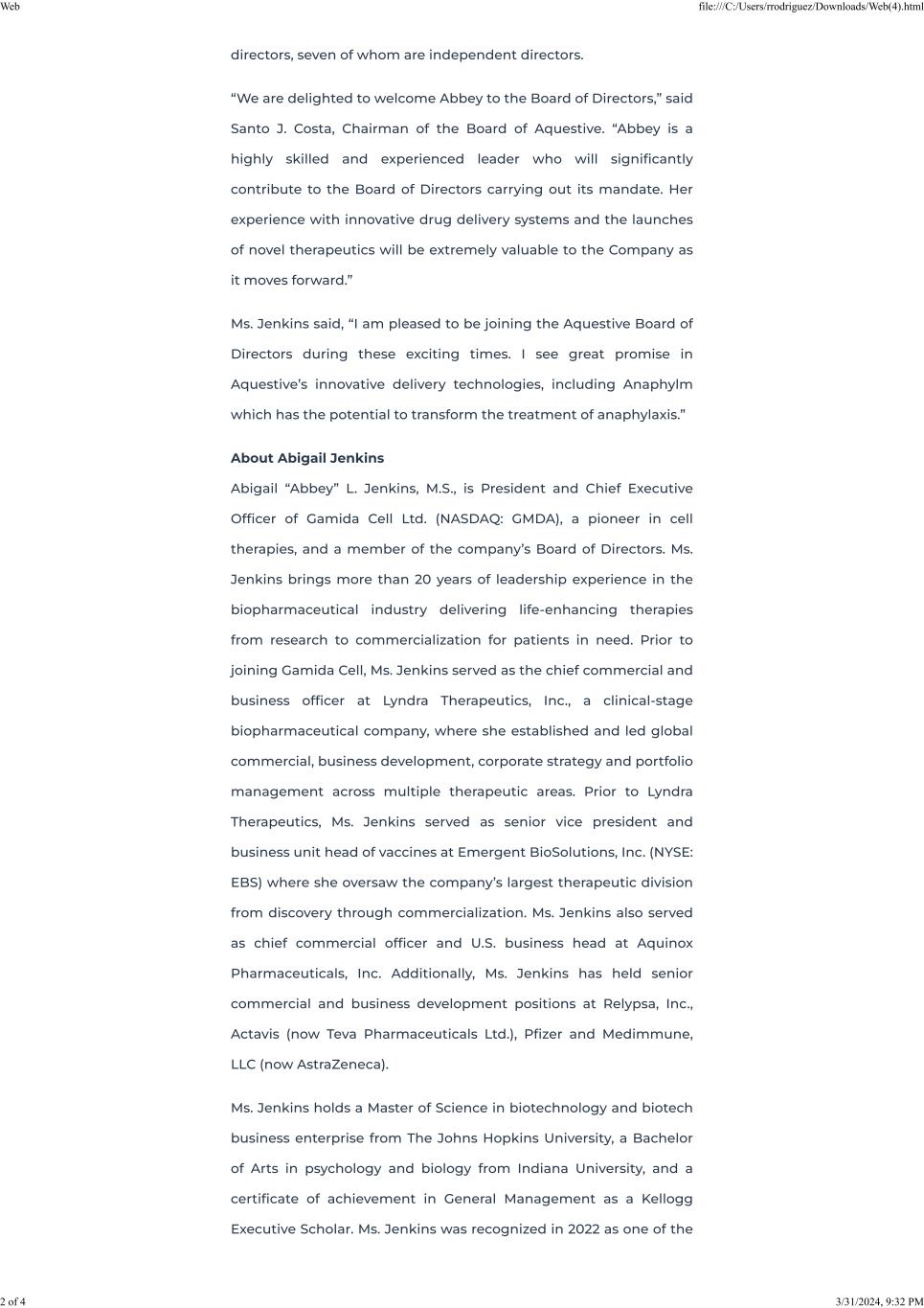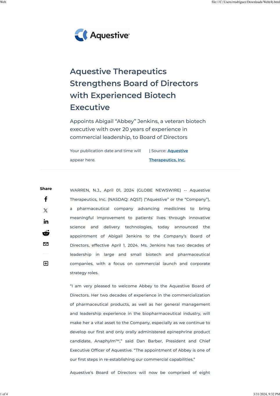 EX-99.1 2 aqstpr4124.htm EX-99.1 aqstpr4124