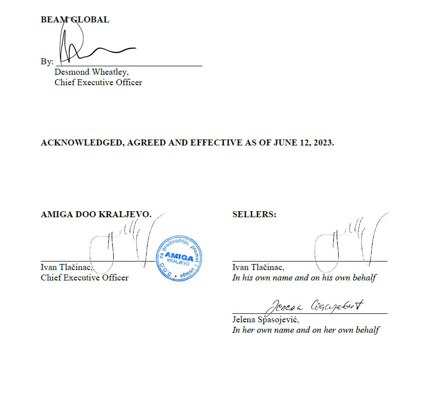 This binding letter of intent (the “Letter”) is entered into as of June 12, 2023 (the “Effective Date”) and summarizes the principal terms of the purchase by Beam Global, a Nevada corporation, or its wholly-owned subsidiary (“Beam”), of 100% of the capital stock of Amiga (the “Transaction”) owned by Mr. Ivan Tlačinac and Mrs. Jelena Spasojević (each a “Seller” and collectively the “Sellers”). Certain capitalized terms not defined below have the meanings set forth on Exhibit A attached hereto.