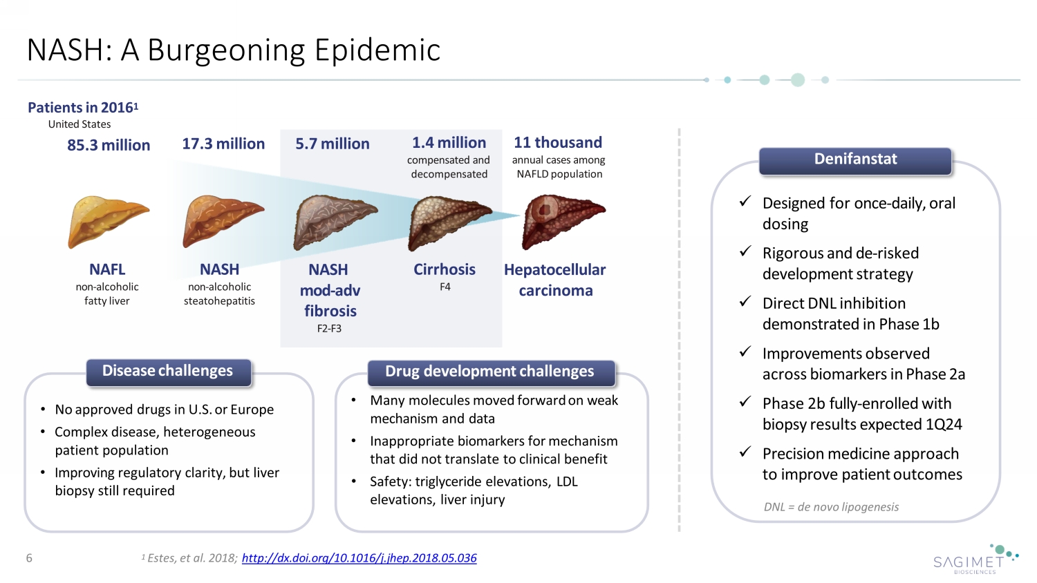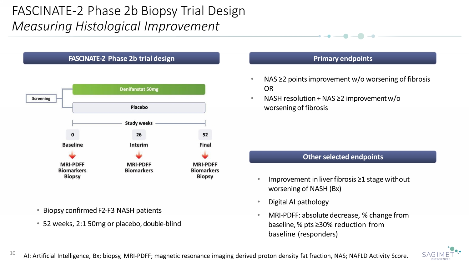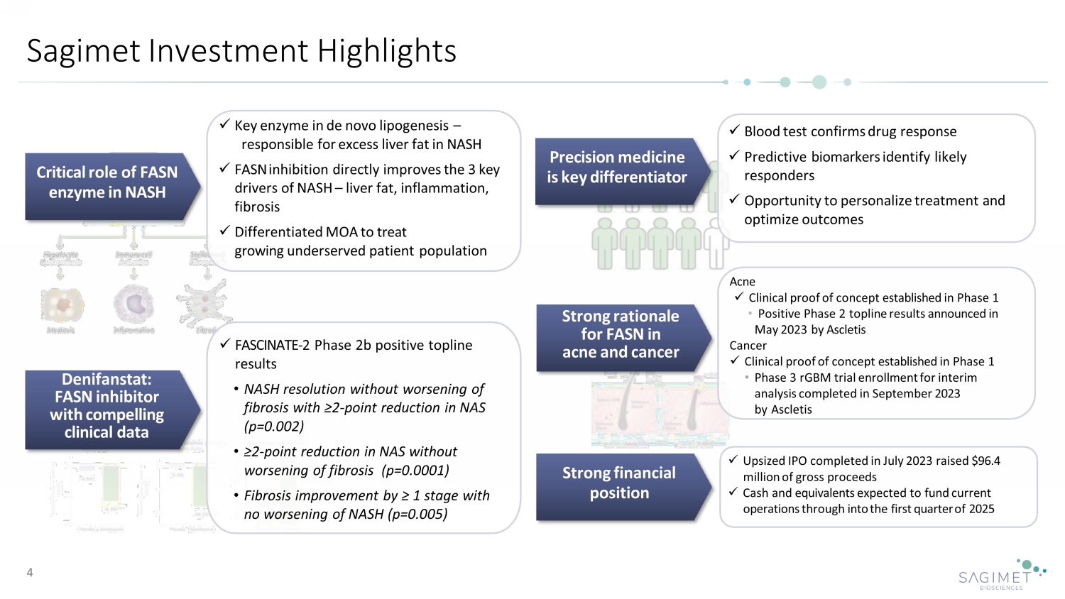 Sagimet Investment Highlights Critical role of FASN enzyme in NASH x Key enzyme in de novo lipogenesis – responsible for excess liver fat in NASH x FASN inhibition directly improves the 3 key drivers of NASH – liver fat, inflammation, fibrosis x Differentiated MOA to treat growing underserved patient population x FASCINATE - 2 Phase 2b positive topline results • NASH resolution without worsening of fibrosis with ≥2 - point reduction in NAS (p=0.002) • ≥2 - point reduction in NAS without worsening of fibrosis (p=0.0001) • Fibrosis improvement by ≥ 1 stage with no worsening of NASH (p=0.005) x Blood test confirms drug response x Predictive biomarkers identify likely responders x Opportunity to personalize treatment and optimize outcomes Acne x Clinical proof of concept established in Phase 1 • Positive Phase 2 topline results announced in May 2023 by Ascletis Cancer x Clinical proof of concept established in Phase 1 • Phase 3 rGBM trial enrollment for interim analysis completed in September 2023 by Ascletis Denifanstat: FASN inhibitor with compelling clinical data Precision medicine is key differentiator Strong rationale for FASN in acne and cancer Strong financial position x Upsized IPO completed in July 2023 raised $96.4 million of gross proceeds x Cash and equivalents expected to fund current operations through into the first quarter of 2025 4