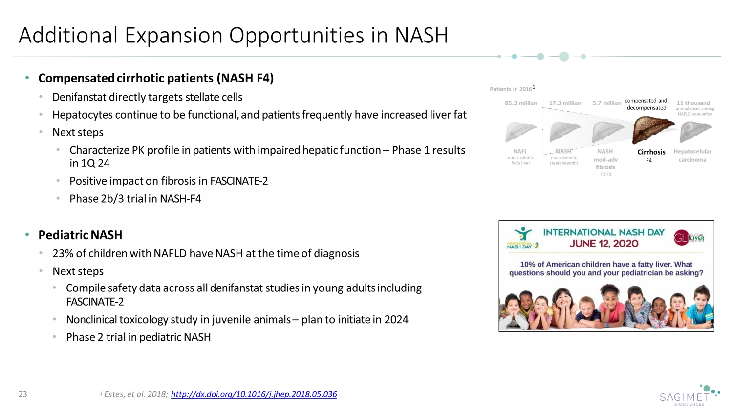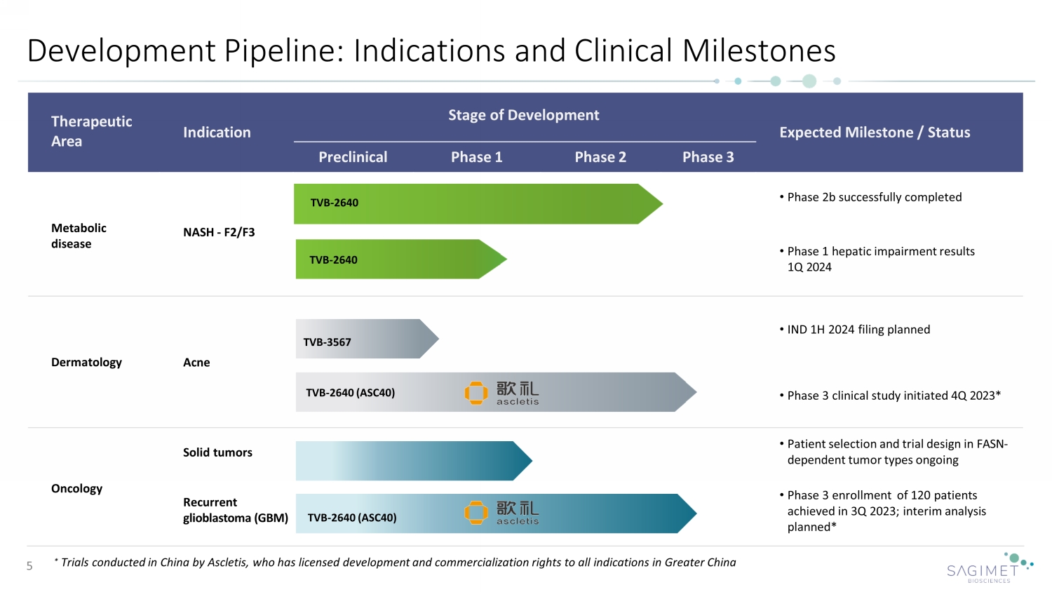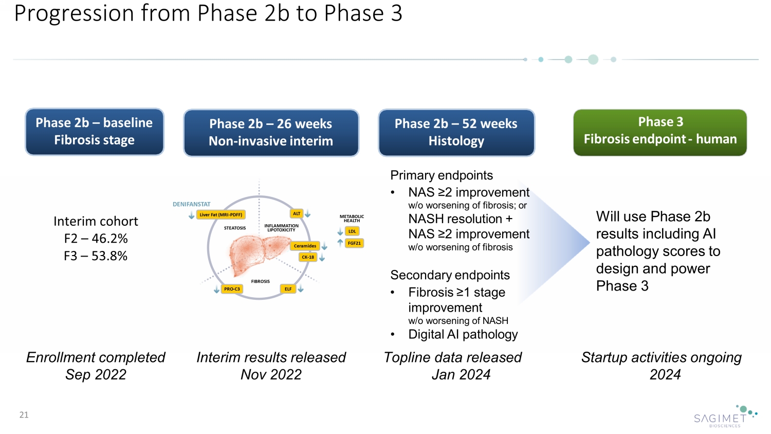Sagimet Investment Highlights Critical role of FASN enzyme in NASH x Key enzyme in de novo lipogenesis – responsible for excess liver fat in NASH x FASN inhibition directly improves the 3 key drivers of NASH – liver fat, inflammation, fibrosis x Differentiated MOA to treat growing underserved patient population x FASCINATE - 2 Phase 2b positive topline results • NASH resolution without worsening of fibrosis with ≥2 - point reduction in NAS (p=0.002) • ≥2 - point reduction in NAS without worsening of fibrosis (p=0.0001) • Fibrosis improvement by ≥ 1 stage with no worsening of NASH (p=0.005) x Blood test confirms drug response x Predictive biomarkers identify likely responders x Opportunity to personalize treatment and optimize outcomes Acne x Clinical proof of concept established in Phase 1 • Positive Phase 2 topline results announced in May 2023 by Ascletis Cancer x Clinical proof of concept established in Phase 1 • Phase 3 rGBM trial enrollment for interim analysis completed in September 2023 by Ascletis Denifanstat: FASN inhibitor with compelling clinical data Precision medicine is key differentiator Strong rationale for FASN in acne and cancer Strong financial position x Upsized IPO completed in July 2023 raised $96.4 million of gross proceeds x Cash and equivalents expected to fund current operations through into the first quarter of 2025 4