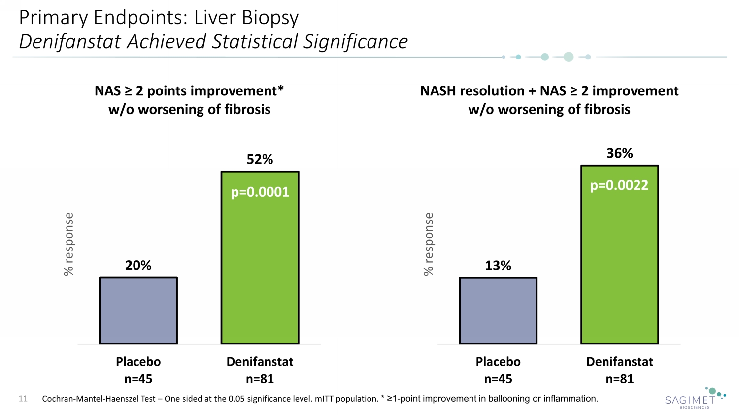 Secondary Endpoints: Liver Biopsy Denifanstat Achieved Statistical Significance 12 Resolution of NASH w/o worsening of fibrosis p= 16% 38% Placebo n=45 Denifanstat n=81 % response p=0.0021 Cochran - Mantel - Haenszel Test – One sided at the 0.05 significance level. mITT population 18% 41% Placebo n=45 Denifanstat n=81 % response Improvement in liver fibrosis ≥ 1 stage w/o worsening of NASH p=0.0051
