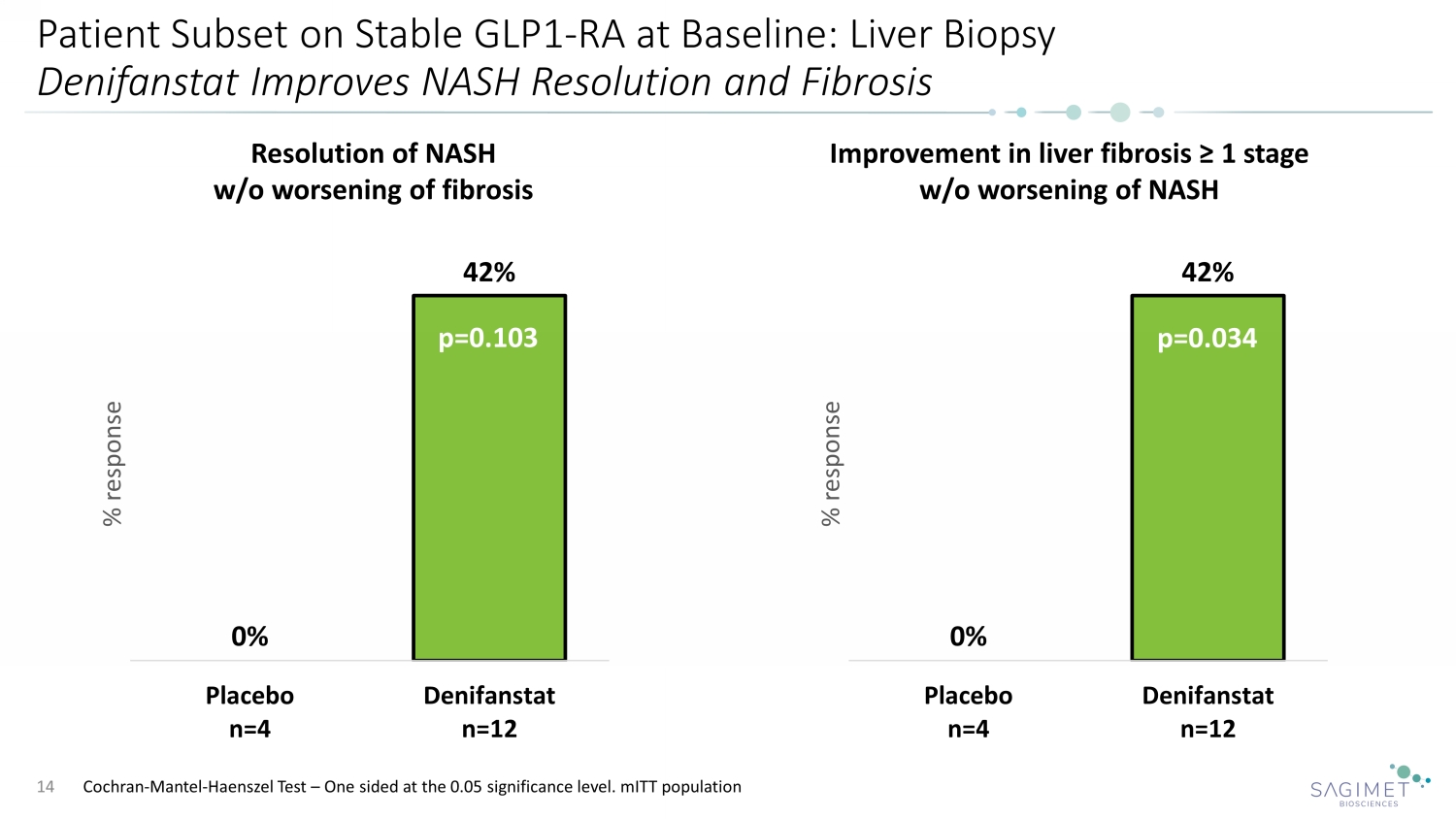 Independent Fibrosis Analysis by AI - based Digital Pathology Supporting Evidence that Denifanstat Significantly Reduced Fibrosis 13 0.10 - 0.30 Placebo n=45 Denifanstat n=81 LS mean change qFibrosis Continuous Value Change from Baseline p=0.0023 Cochran - Mantel - Haenszel Test – One sided at the 0.05 significance level. LS means; least squares mean. HistoIndex platform. mITT population.