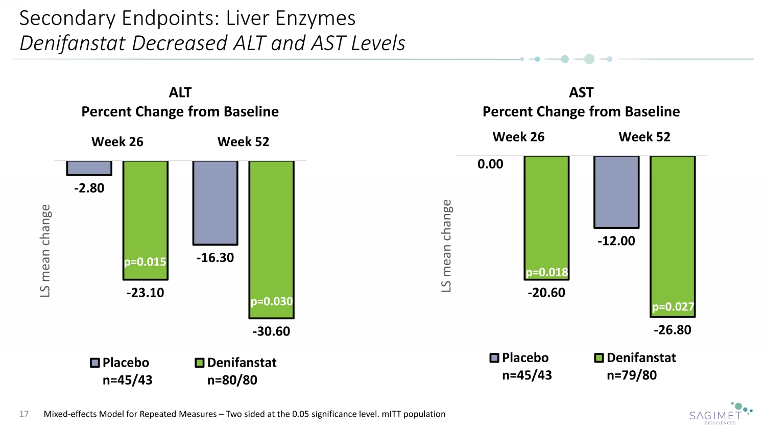 Secondary Endpoint: Liver Fat by MRI - PDFF Denifanstat Achieved Statistical Significance 16 21% 65% Placebo n=38 Denifanstat n=69 % response MRI - PDFF ≥ 30% Relative Reduction, Week 52 p<0.0001 MRI - PDFF Relative Change from Baseline 5% - 8% - 25% - 31% Week 26 Week 52 LS mean change Placebo n=37/38 Denifanstat n=68/72 p=0.0008 p=0.0036 > 30% reduction: Cochran - Mantel - Haenszel Test. Relative reduction: Mixed - effects Model for Repeated Measures . mITT population