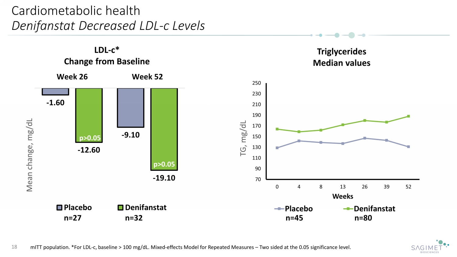 Secondary Endpoints: Liver Enzymes Denifanstat Decreased ALT and AST Levels 17 ALT Percent Change from Baseline AST Percent Change from Baseline Mixed - effects Model for Repeated Measures – Two sided at the 0.05 significance level. mITT population - 2.80 - 16.30 - 23.10 - 30.60 Week 26 Week 52 LS mean change Placebo n=45/43 Denifanstat n=80/80 p=0.015 p=0.030 0.00 - 12.00 - 20.60 - 26.80 Week 26 Week 52 LS mean change Placebo n=45/43 Denifanstat n=79/80 p=0.018 p=0.027