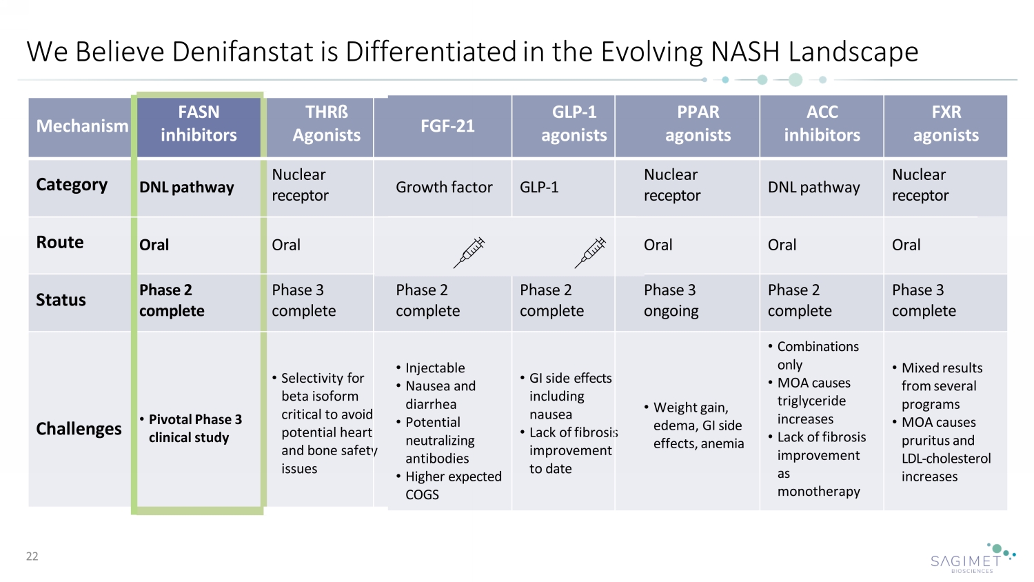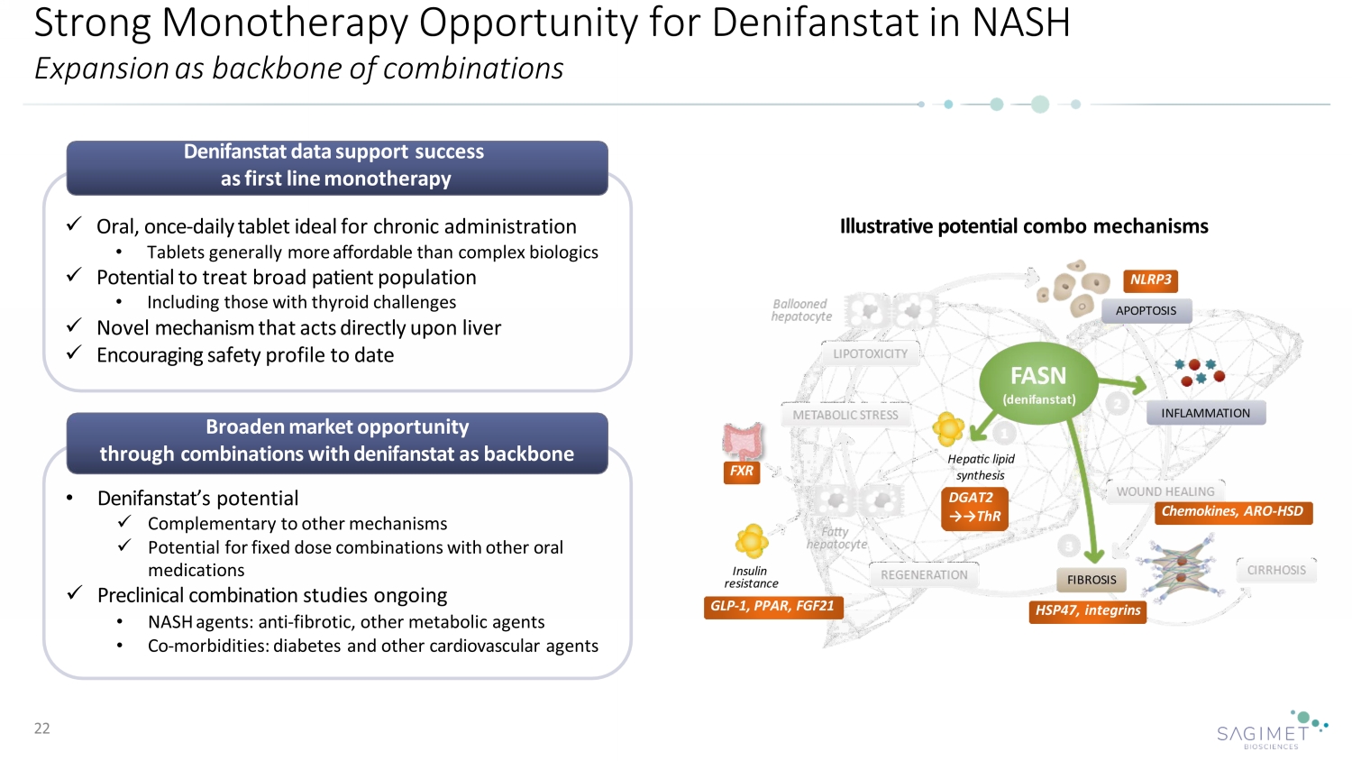 Precision Medicine: Blood Tests May Lead to Improved Patient Outcomes 1 Signature has 6 metabolites: ursodeoxycholic acid, DL - 2 - aminocaprylic acid, sarcosine, glycoursodeoxycholic acid, D( - ) - 2 - aminobutyric acid, PC(0 - 18:0/22:4). Accuracy 79%, PPV 88%, NPV 63%. Blood test for predictive marker denifanstat denifanstat • NASH is a multi - faceted disease and patients may benefit from being matched with optimal treatments • Two approaches using blood tests are undergoing further evaluation • Drug response: 1 - 2 months after taking drug, tripalmitin identifies patients responding to drug treatment • Predictive marker: before taking drug, signature of 6 blood metabolites enriches for responders 1 Blood test for drug response (e.g. tripalmitin) Clinical response rate denifanstat Clinical response rate On - treatment 1 - 2 months Pre - treatment 21