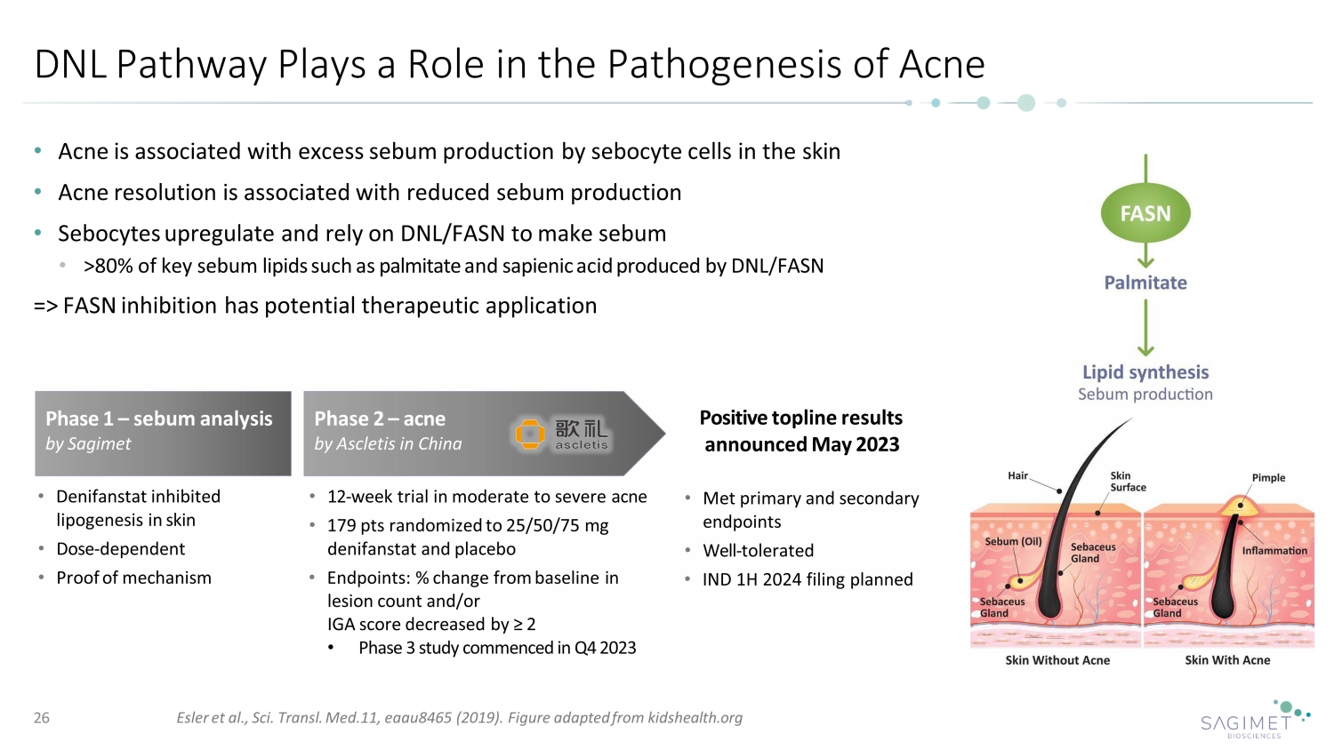 DNL Pathway Plays a Role in the Pathogenesis of Acne • Acne is associated with excess sebum production by sebocyte cells in the skin • Acne resolution is associated with reduced sebum production • Sebocytes upregulate and rely on DNL/FASN to make sebum • >80% of key sebum lipids such as palmitate and sapienic acid produced by DNL/FASN => FASN inhibition has potential therapeutic application Esler et al., Sci. Transl. Med.11, eaau8465 (2019). Figure adapted from kidshealth.org Phase 2 – acne by Ascletis in China Phase 1 – sebum analysis by Sagimet Positive topline results announced May 2023 • Denifanstat inhibited lipogenesis in skin • Dose - dependent • Proof of mechanism • 12 - week trial in moderate to severe acne • 179 pts randomized to 25/50/75 mg denifanstat and placebo • Endpoints: % change from baseline in lesion count and/or IGA score decreased by ≥ 2 • Phase 3 study commenced in Q4 2023 • Met primary and secondary endpoints • Well - tolerated • IND 1H 2024 filing planned 26