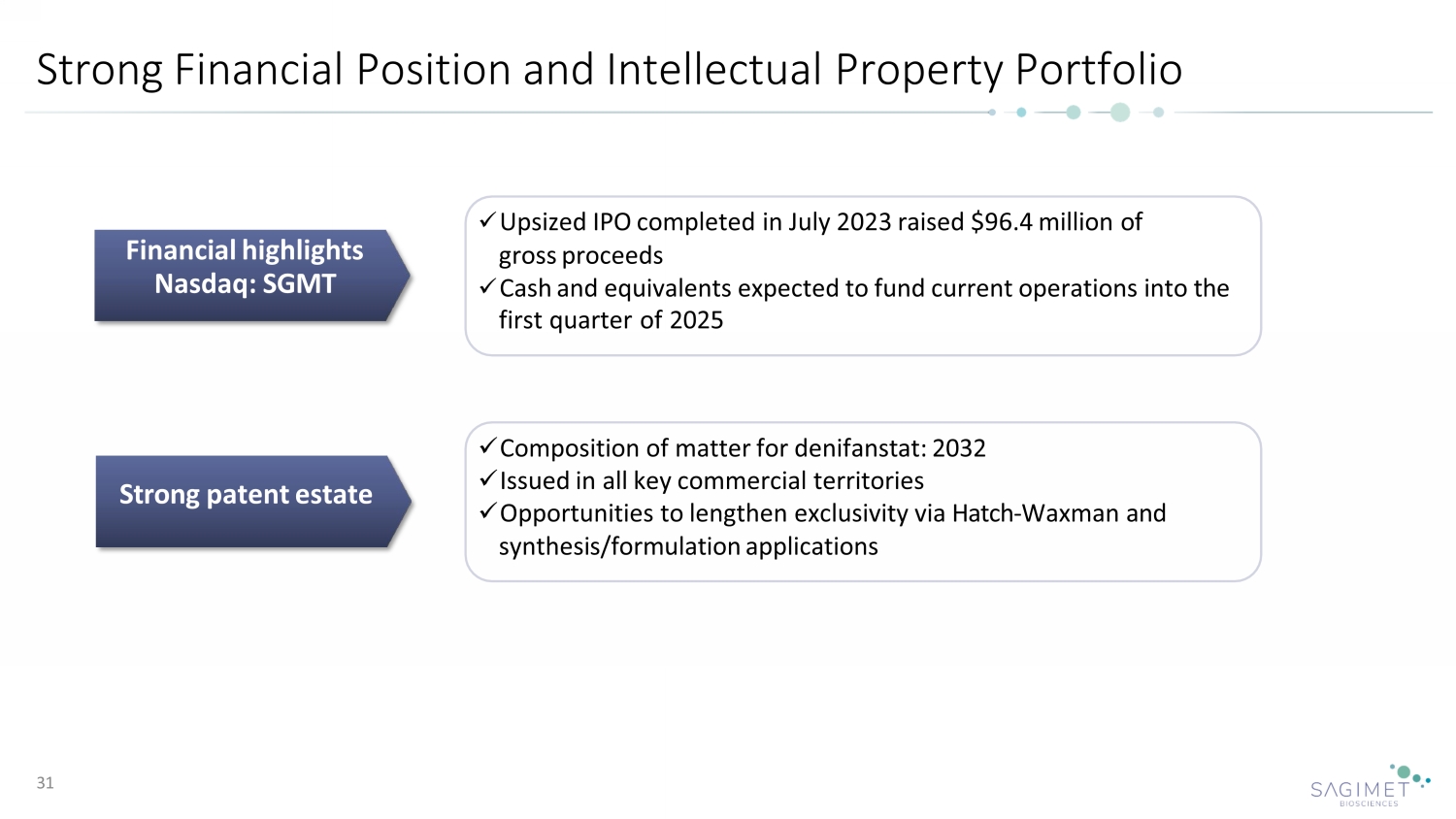 Strong Financial Position and Intellectual Property Portfolio Financial highlights Nasdaq: SGMT x Upsized IPO completed in July 2023 raised $96.4 million of gross proceeds x Cash and equivalents expected to fund current operations into the first quarter of 2025 Strong patent estate x Composition of matter for denifanstat: 2032 x Issued in all key commercial territories x Opportunities to lengthen exclusivity via Hatch - Waxman and synthesis/formulation applications 31