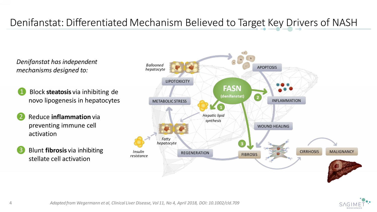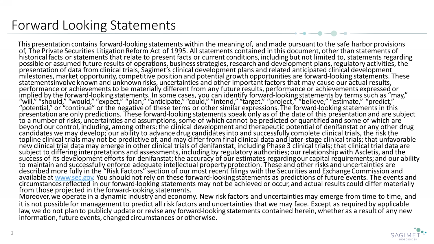Forward Looking Statements 3 This presentation contains forward - looking statements within the meaning of, and made pursuant to the safe harbor provisions of, The Private Securities Litigation Reform Act of 1995. All statements contained in this document, other than statements of historical facts or statements that relate to present facts or current conditions, including but not limited to, statements regarding possible or assumed future results of operations, business strategies, research and development plans, regulatory activities, the presentation of data from clinical trials, Sagimet’s clinical development plans and related anticipated clinical development milestones, market opportunity, competitive position and potential growth opportunities are forward - looking statements. These statements involve known and unknown risks, uncertainties and other important factors that may cause our actual results, performance or achievements to be materially different from any future results, performance or achievements expressed or implied by the forward - looking statements. In some cases, you can identify forward - looking statements by terms such as “may,” “will,” “should,” “would,” “expect,” “plan,” “anticipate,” “could,” “intend,” “target,” “project,” “believe,” “estimate,” “predict,” “potential,” or “continue” or the negative of these terms or other similar expressions. The forward - looking statements in this presentation are only predictions. These forward - looking statements speak only as of the date of this presentation and are subject to a number of risks, uncertainties and assumptions, some of which cannot be predicted or quantified and some of which are beyond our control, including, among others: the clinical development and therapeutic potential of denifanstat or any other drug candidates we may develop; our ability to advance drug candidates into and successfully complete clinical trials , the risk the topline clinical trials may not be predictive of, and may differ from final clinical data and later - stage clinical trials; that unfavorable new clinical trial data may emerge in other clinical trials of denifanstat , including Phase 3 clinical trials; that clinical trial data are subject to differing interpretations and assessments, including by regulatory authorities; our relationship with Ascletis , and the success of its development efforts for denifanstat ; the accuracy of our estimates regarding our capital requirements; and our ability to maintain and successfully enforce adequate intellectual property protection. These and other risks and uncertainties are described more fully in the “Risk Factors” section of our most recent filings with the Securities and Exchange Commission and available at www.sec.gov . You should not rely on these forward - looking statements as predictions of future events. The events and circumstances reflected in our forward - looking statements may not be achieved or occur, and actual results could differ materially from those projected in the forward - looking statements. Moreover, we operate in a dynamic industry and economy. New risk factors and uncertainties may emerge from time to time, and it is not possible for management to predict all risk factors and uncertainties that we may face. Except as required by applicable law, we do not plan to publicly update or revise any forward - looking statements contained herein, whether as a result of any new information, future events, changed circumstances or otherwise.