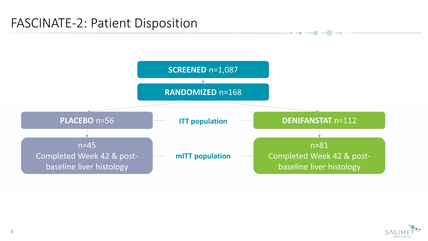 FASCINATE - 2: Patient Disposition 6 SCREENED n=1,087 RANDOMIZED n=168 PLACEBO n=56 DENIFANSTAT n=112 n=45 Completed Week 42 & post - baseline liver histology n=81 Completed Week 42 & post - baseline liver histology ITT population mITT population