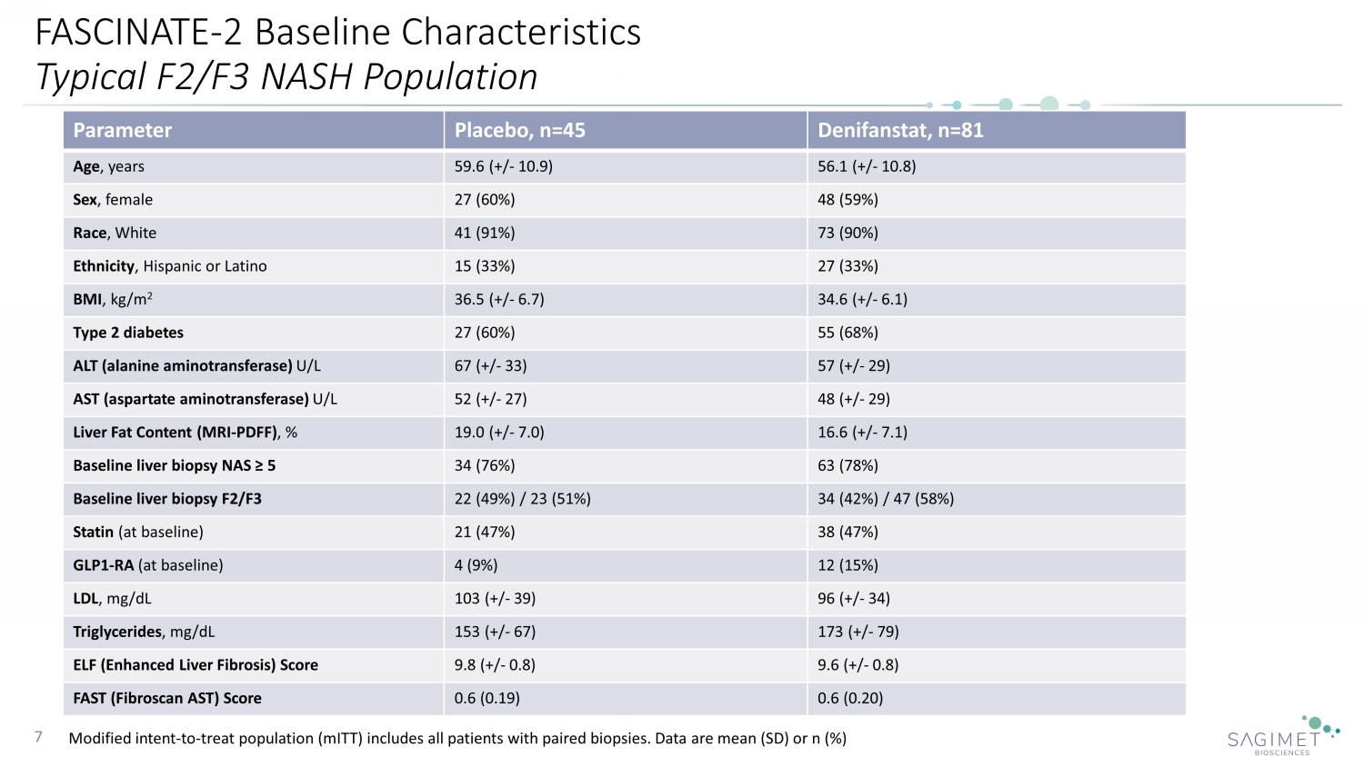 FASCINATE - 2 Baseline Characteristics Typical F2/F3 NASH Population Modified intent - to - treat population ( mITT ) includes all patients with paired biopsies. Data are mean (SD) or n (%) 7 Parameter Placebo, n=45 Denifanstat, n=81 Age , years 59.6 (+/ - 10.9) 56.1 (+/ - 10.8) Sex , female 27 (60%) 48 (59%) Race , White 41 (91%) 73 (90%) Ethnicity , Hispanic or Latino 15 (33%) 27 (33%) BMI , kg/m 2 36.5 (+/ - 6.7) 34.6 (+/ - 6.1) Type 2 diabetes 27 (60%) 55 (68%) ALT (alanine aminotransferase) U/L 67 (+/ - 33) 57 (+/ - 29) AST (aspartate aminotransferase) U/L 52 (+/ - 27) 48 (+/ - 29) Liver Fat Content (MRI - PDFF) , % 19.0 (+/ - 7.0) 16.6 (+/ - 7.1) Baseline liver biopsy NAS ≥ 5 34 (76%) 63 (78%) Baseline liver biopsy F2/F3 22 (49%) / 23 (51%) 34 (42%) / 47 (58%) Statin (at baseline) 21 (47%) 38 (47%) GLP1 - RA (at baseline) 4 (9%) 12 (15%) LDL , mg/dL 103 ( +/ - 39) 96 ( +/ - 34) Triglycerides , mg/dL 153 ( +/ - 67) 173 ( +/ - 79) ELF (Enhanced Liver Fibrosis) Score 9.8 ( +/ - 0.8) 9.6 ( +/ - 0.8) FAST (Fibroscan AST) Score 0.6 (0.19) 0.6 (0.20)