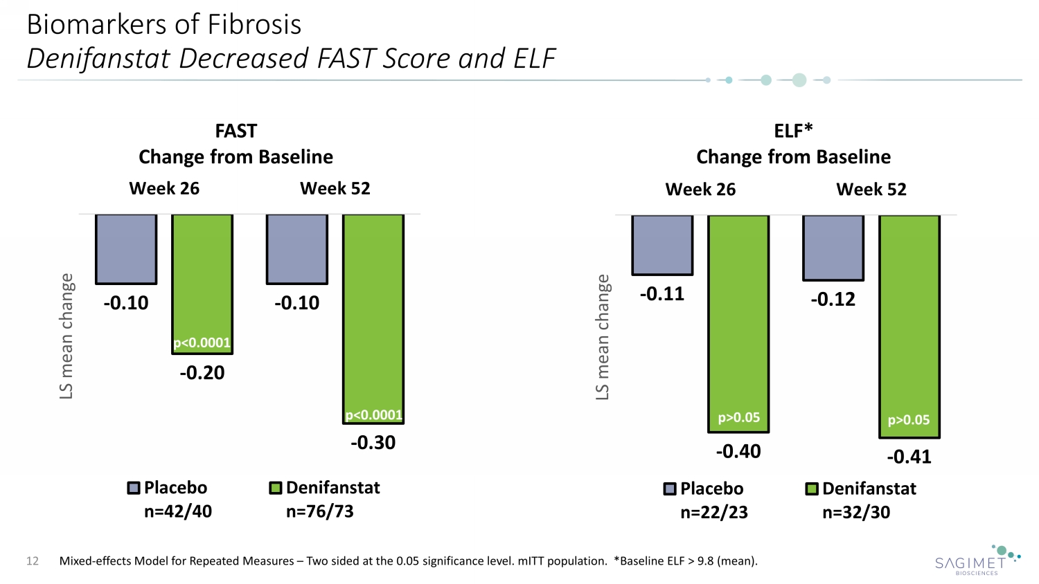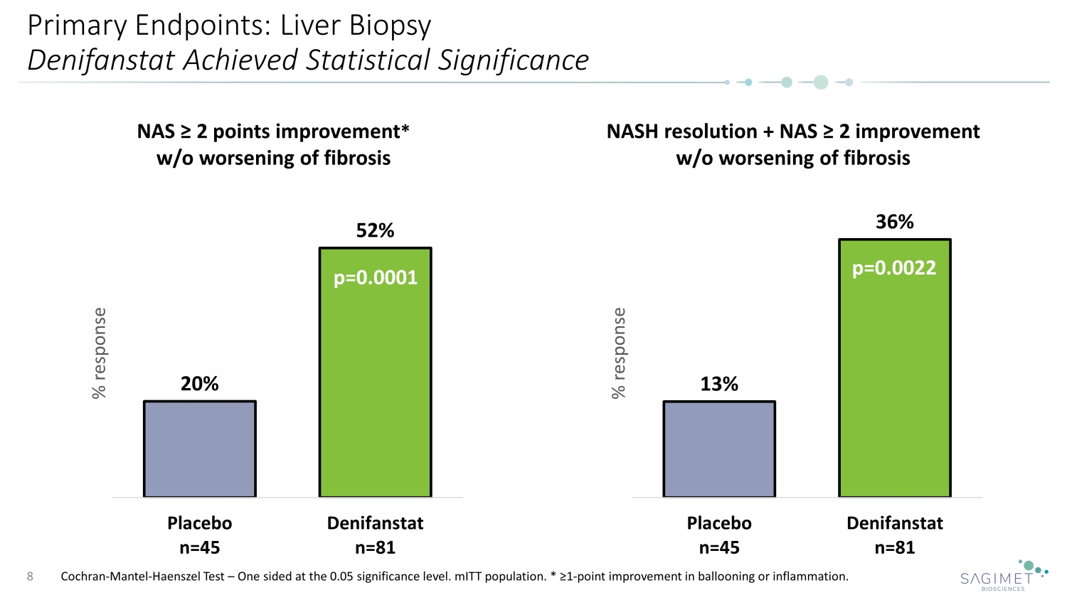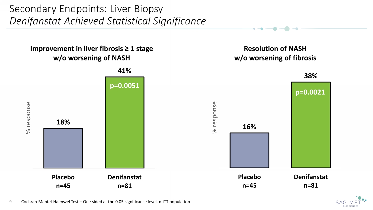 Independent Fibrosis Analysis by AI - based Digital Pathology Supporting Evidence that Denifanstat Significantly Reduced Fibrosis 10 0.10 - 0.30 Placebo n=45 Denifanstat n=81 LS mean change qFibrosis Continuous Value Change from Baseline p=0.0023 Cochran - Mantel - Haenszel Test – One sided at the 0.05 significance level. LS means; least squares mean. HistoIndex platform. mITT population.