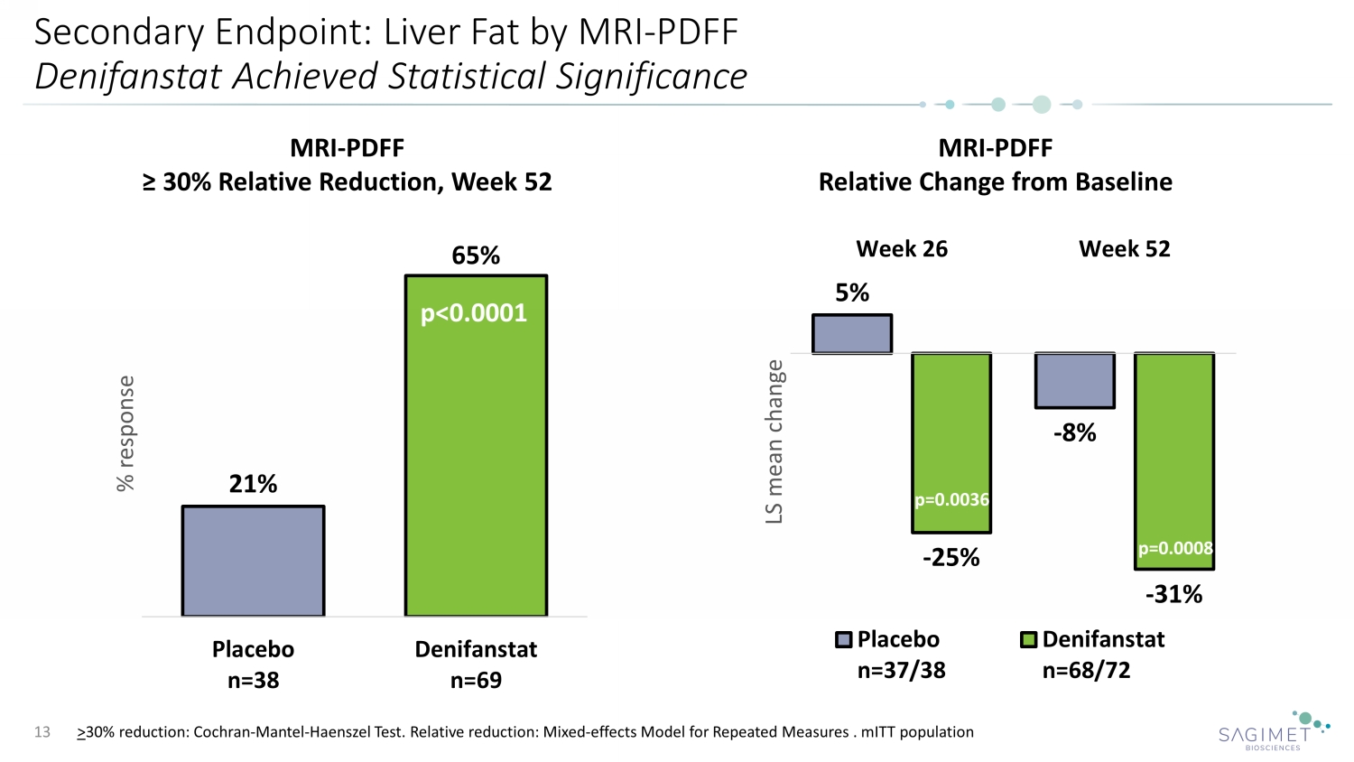 Biomarkers of Fibrosis Denifanstat Decreased FAST Score and ELF Mixed - effects Model for Repeated Measures – Two sided at the 0.05 significance level. mITT population. *Baseline ELF > 9.8 (mean). 12 p= p= - 0.11 - 0.12 - 0.40 - 0.41 Week 26 Week 52 LS mean change Placebo n=22/23 Denifanstat n=32/30 ELF* Change from Baseline - 0.10 - 0.10 - 0.20 - 0.30 Week 26 Week 52 LS mean change Placebo n=42/40 Denifanstat n=76/73 FAST Change from Baseline p<0.0001 p<0.0001 p>0.05 p>0.05