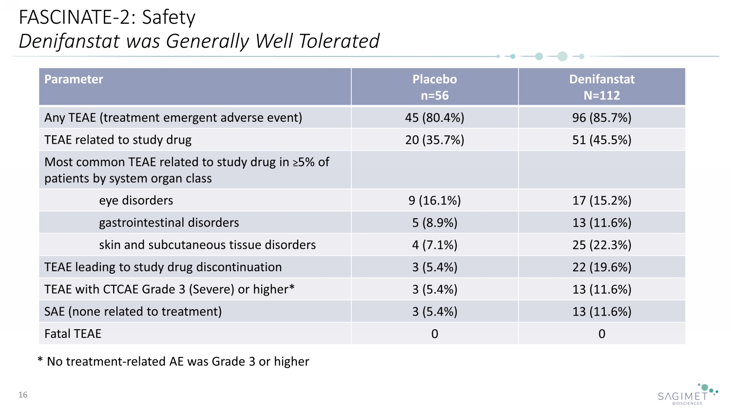 FASCINATE - 2: Safety Denifanstat was Generally Well Tolerated 16 Parameter Placebo n=56 Denifanstat N=112 Any TEAE (treatment emergent adverse event) 45 (80.4%) 96 (85.7%) TEAE related to study drug 20 (35.7%) 51 (45.5%) Most common TEAE related to study drug in ≥ 5% of patients by system organ class eye disorders 9 (16.1%) 17 (15.2%) gastrointestinal disorders 5 (8.9%) 13 (11.6%) skin and subcutaneous tissue disorders 4 (7.1%) 25 (22.3%) TEAE leading to study drug discontinuation 3 (5.4%) 22 (19.6%) TEAE with CTCAE Grade 3 (Severe) or higher* 3 (5.4%) 13 (11.6%) SAE (none related to treatment) 3 (5.4%) 13 (11.6%) Fatal TEAE 0 0 * No treatment - related AE was Grade 3 or higher
