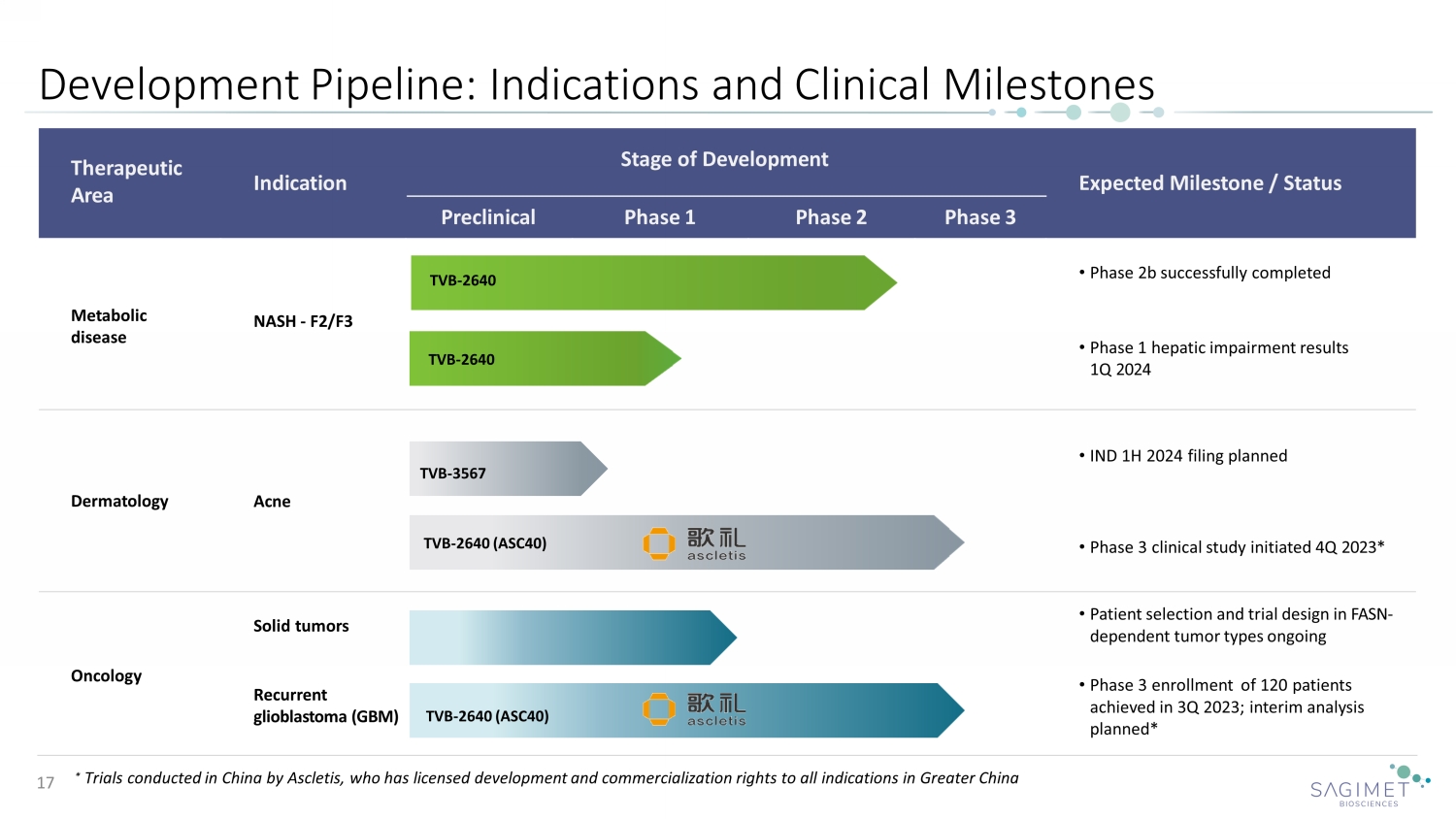 Therapeutic Area Stage of Development Indication Expected Milestone / Status Preclinical Phase 1 Phase 2 Phase 3 Metabolic disease • Phase 2b successfully completed NASH - F2/F3 • Phase 1 hepatic impairment results 1Q 2024 Dermatology Acne • IND 1H 2024 filing planned • Phase 3 clinical study initiated 4 Q 2023 * Oncology Solid tumors • Patient selection and trial design in FASN - dependent tumor types ongoing Recurrent glioblastoma ( GBM ) • Phase 3 enrollment of 120 patients achieved in 3Q 2023; interim analysis planned * Development Pipeline : Indications and Clinical Milestones 17 * Trials conducted in China by Ascletis, who has licensed development and commercialization rights to all indications in Greater China TVB - 2640 TVB - 2640 TVB - 2640 (ASC40) TVB - 2640 (ASC40) TVB - 3567