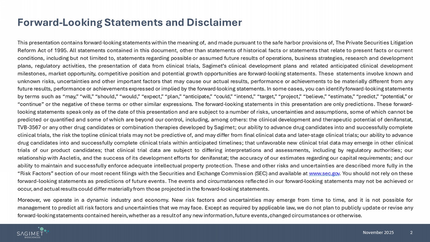 2 November 2025 Forward - Looking Statements and Disclaimer This presentation contains forward - looking statements within the meaning of, and made pursuant to the safe harbor provisions of, The Private Securities Litigation Reform Act of 1995 . All statements contained in this document, other than statements of historical facts or statements that relate to present facts or current conditions, including but not limited to, statements regarding possible or assumed future results of operations, business strategies, research and development plans, regulatory activities, the presentation of data from clinical trials, Sagimet’s clinical development plans and related anticipated clinical development milestones, market opportunity, competitive position and potential growth opportunities are forward - looking statements . These statements involve known and unknown risks, uncertainties and other important factors that may cause our actual results, performance or achievements to be materially different from any future results, performance or achievements expressed or implied by the forward - looking statements . In some cases, you can identify forward - looking statements by terms such as “may,” “will,” “should,” “would,” “expect,” “plan,” “anticipate,” “could,” “intend,” “target,” “project,” “believe,” “estimate,” “predict,” “potential,” or “continue” or the negative of these terms or other similar expressions . The forward - looking statements in this presentation are only predictions . These forward - looking statements speak only as of the date of this presentation and are subject to a number of risks, uncertainties and assumptions, some of which cannot be predicted or quantified and some of which are beyond our control, including, among others : the clinical development and therapeutic potential of denifanstat , TVB - 3567 or any other drug candidates or combination therapies developed by Sagimet ; our ability to advance drug candidates into and successfully complete clinical trials , the risk the topline clinical trials may not be predictive of, and may differ from final clinical data and later - stage clinical trials ; our ability to advance drug candidates into and successfully complete clinical trials within anticipated timelines ; that unfavorable new clinical trial data may emerge in other clinical trials of our product candidates ; that clinical trial data are subject to differing interpretations and assessments, including by regulatory authorities ; our relationship with Ascletis , and the success of its development efforts for denifanstat ; the accuracy of our estimates regarding our capital requirements ; and our ability to maintain and successfully enforce adequate intellectual property protection . These and other risks and uncertainties are described more fully in the “Risk Factors” section of our most recent filings with the Securities and Exchange Commission (SEC) and available at www . sec . gov . You should not rely on these forward - looking statements as predictions of future events . The events and circumstances reflected in our forward - looking statements may not be achieved or occur, and actual results could differ materially from those projected in the forward - looking statements . Moreover, we operate in a dynamic industry and economy . New risk factors and uncertainties may emerge from time to time, and it is not possible for management to predict all risk factors and uncertainties that we may face . Except as required by applicable law, we do not plan to publicly update or revise any forward - looking statements contained herein, whether as a result of any new information, future events, changed circumstances or otherwise .
