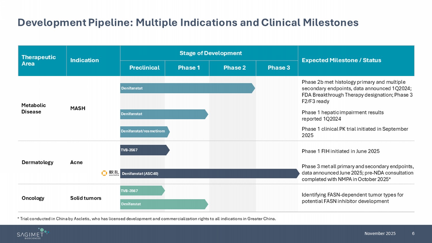 5 November 2025 Strong IP, Cash Position, and Collaboration Potential • Denifanstat met all primary and secondary endpoints in Phase 3 clinical trial in patients with moderate to severe acne vulgaris in China conducted by license partner for China, Ascletis • Ascletis announced that it completed its pre - New Drug Application (NDA) consultation with China National Medical Products Administration (NMPA) and plans to submit an NDA soon to the NMPA • Denifanstat: • Method of use patent — 2036; potential PTE to 2041 • Composition of matter patent — 2032 • Combination of denifanstat and resmetirom: • Application filed 2024; if granted — 2044; potential PTE to 2048 • TVB - 3567: • Method of use application for TVB - 3567 for acne filed 2025; if granted — 2046 • Composition of matter patent — 2035; potential PTE to 2038 Cash Position • Nasdaq: SGMT; $125.5M cash on hand*, expected to fund current operations for 2 years Strategic Collaboration with Ascletis in Acne IP Portfolio *Cash, cash equivalents and marketable securities as of 09/30/2025
