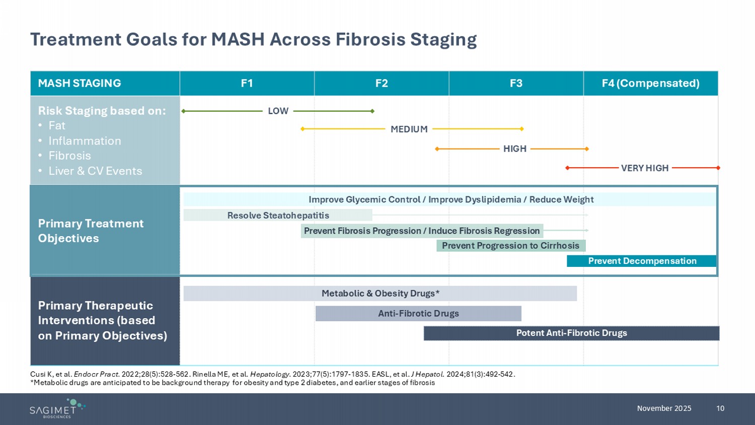 10 November 2025 Treatment Goals for MASH Across Fibrosis Staging F4 (Compensated) F3 F2 F1 MASH STAGING Risk Staging based on: • Fat • Inflammation • Fibrosis • Liver & CV Events Primary Treatment Objectives Primary Therapeutic Interventions (based on Primary Objectives) Improve Glycemic Control / Improve Dyslipidemia / Reduce Weight Resolve Steatohepatitis Prevent Progression to Cirrhosis Prevent Decompensation Metabolic & Obesity Drugs* Anti - Fibrotic Drugs Potent Anti - Fibrotic Drugs Prevent Fibrosis Progression / Induce Fibrosis Regression LOW MEDIUM HIGH VERY HIGH Cusi K, et al. Endocr Pract . 2022;28(5):528 - 562. Rinella ME, et al. Hepatology. 2023;77(5):1797 - 1835. EASL, et al. J Hepatol. 2024;81(3):492 - 542. *Metabolic drugs are anticipated to be background therapy for obesity and type 2 diabetes, and earlier stages of fibrosis